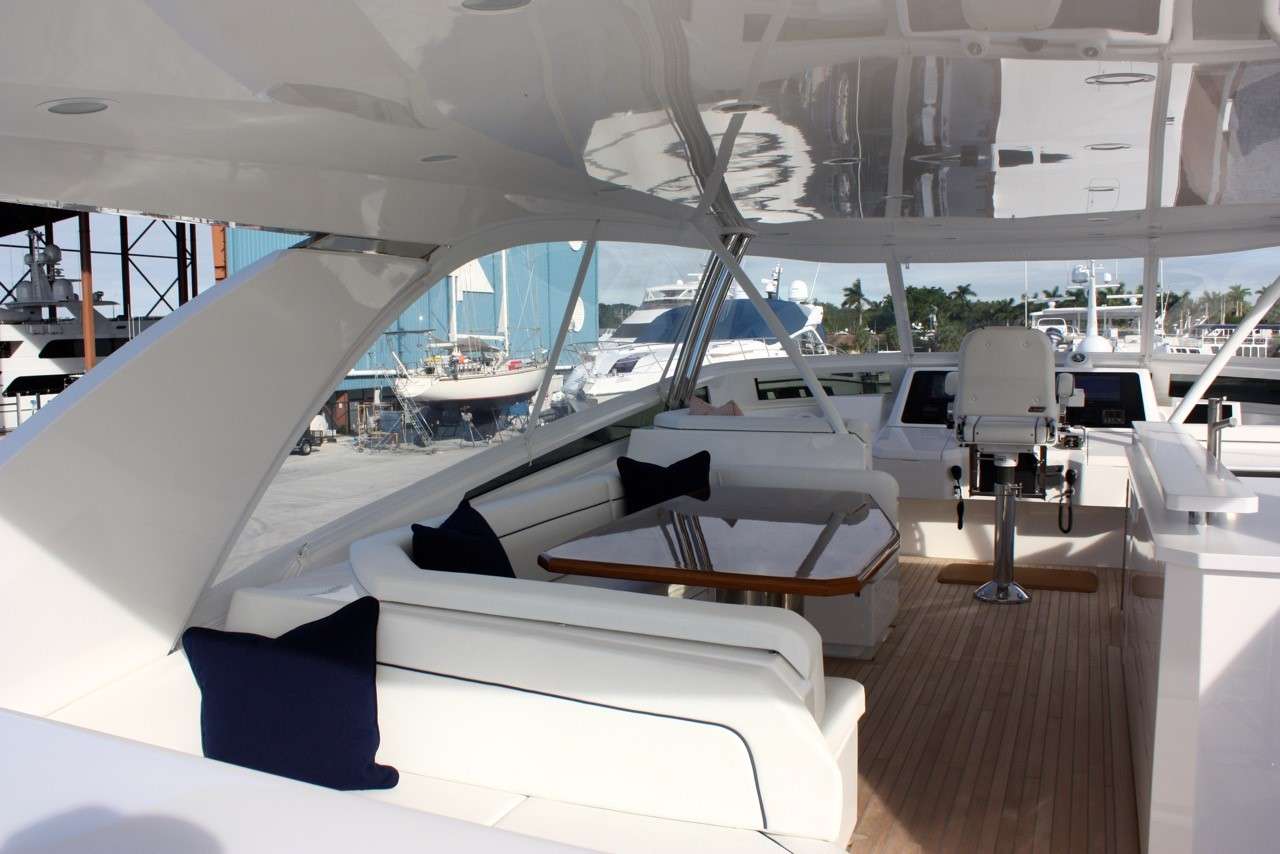 The aft deck has a large sun pad, ice maker, wet bar as well as a barbecue. Forward, there is a shaded seating area with sun loungers on the bow.