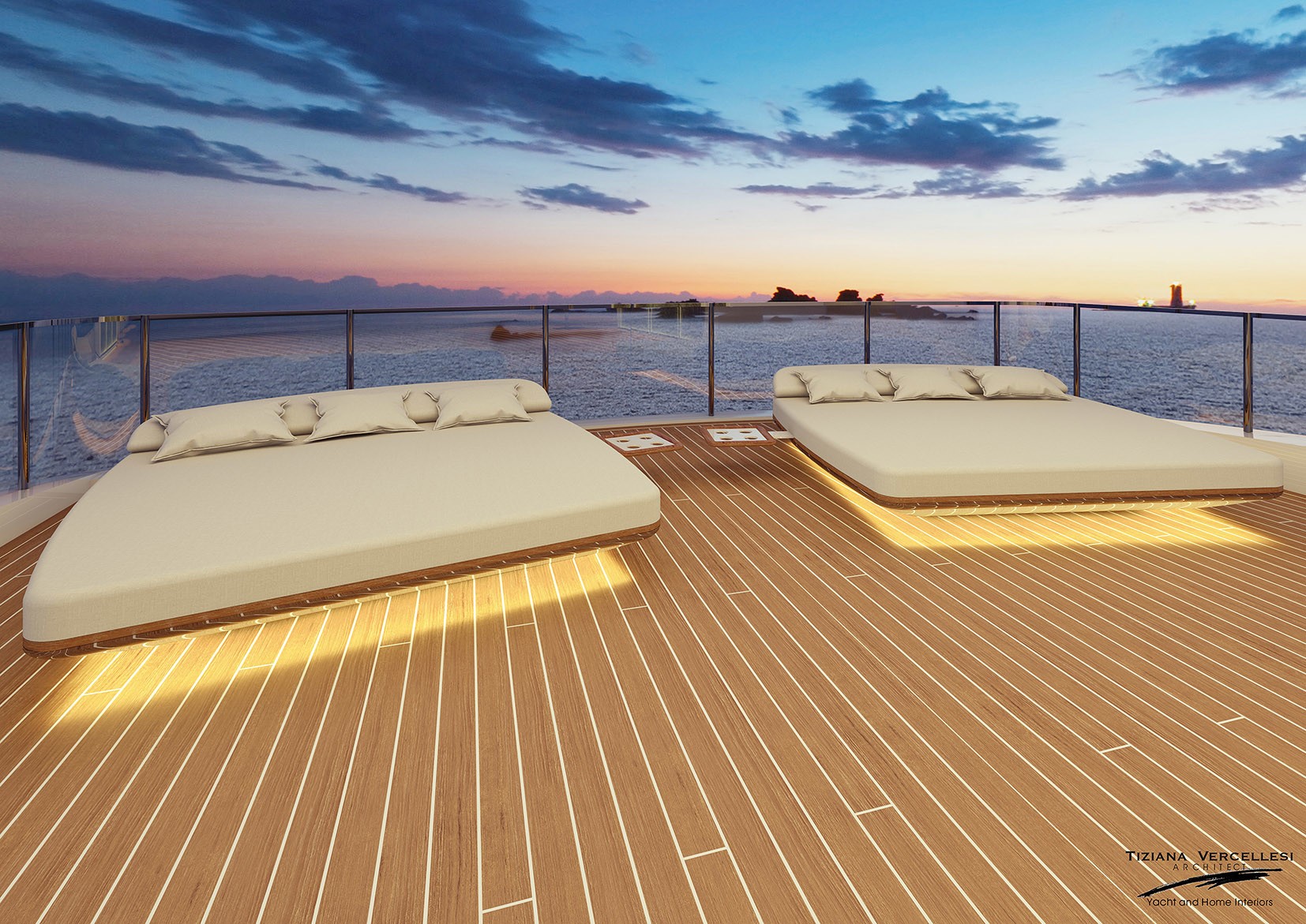 A massive Jacuzzi is placed on the sundeck forward for the best views day or night, while under the central section the wet bar has an impressive selection of refreshments for guests of all ages dining alfresco at the 12-person ...