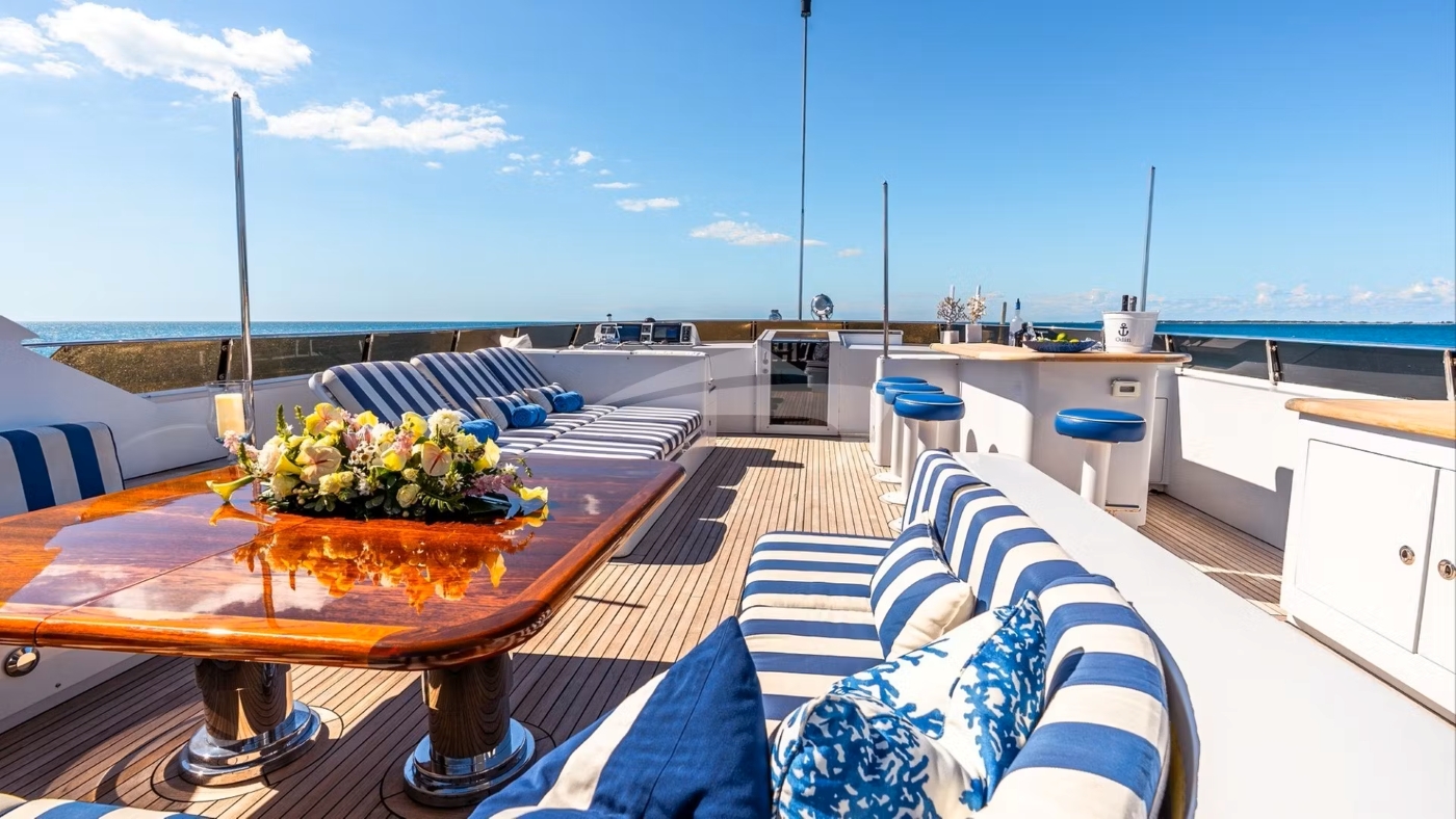 Constructed with an aluminium hull and superstructure, her classic exterior is matched by a timeless interior from Claudette Bonville. The accommodation sleeps up to eight guests over four stately en-suite cabins.