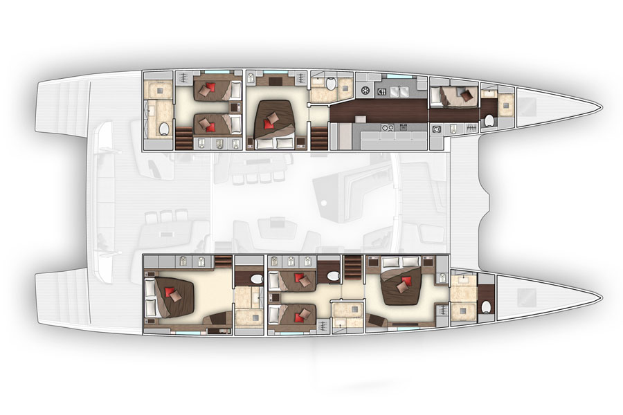 Measuring 23,28m (77’) in LOA and 11m (36’) in width, BABAC is an exceptional catamaran charter yacht offering great layout and large spaces. She was launched in 2018 belongs to the Lagoon Seventy7 series, the largest cat built by the shipyard at the time of her delivery.
