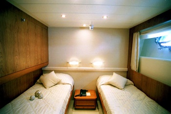 Motor Yacht LAYAZULA comfortably accommodates 10 guests in 4 stylish and elegant cabins. The Master Cabin is located forward on the main deck and boasts a large king sized bed and ensuite with spa pool tub/steam room. On the lower deck you’ll find the full beam width VIP cabin with en-suite bathroom and two identical twin cabins.