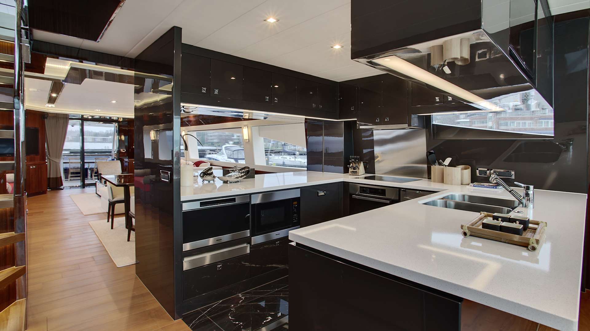 Further forward there is a spacious open-plan galley and the aft exterior deck area offers another lounging area.