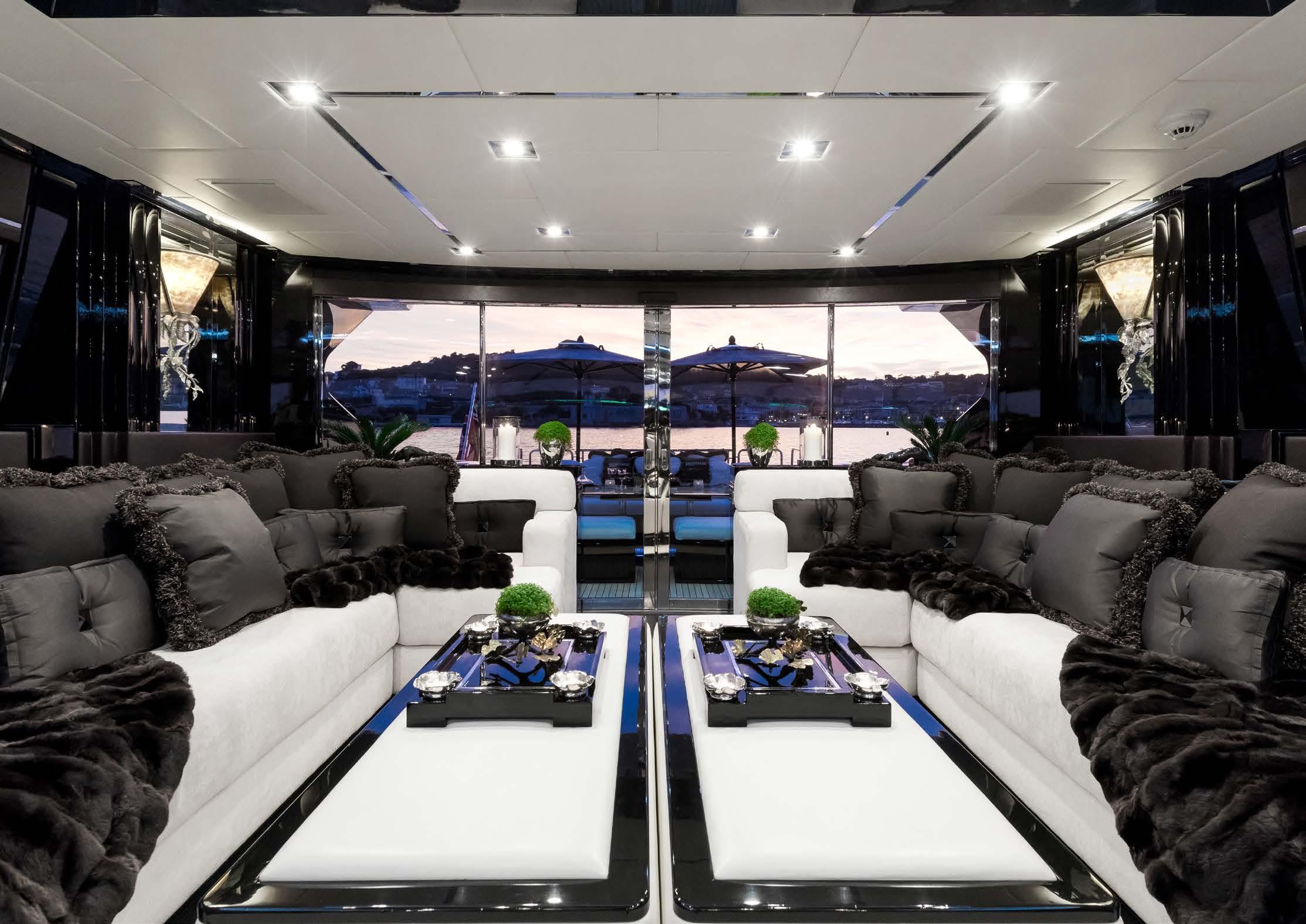 Gloss ebony panelling complements the white furnishings, all of which is shown off at its best by the natural light pouring into the salon from the long windows running down both sides.