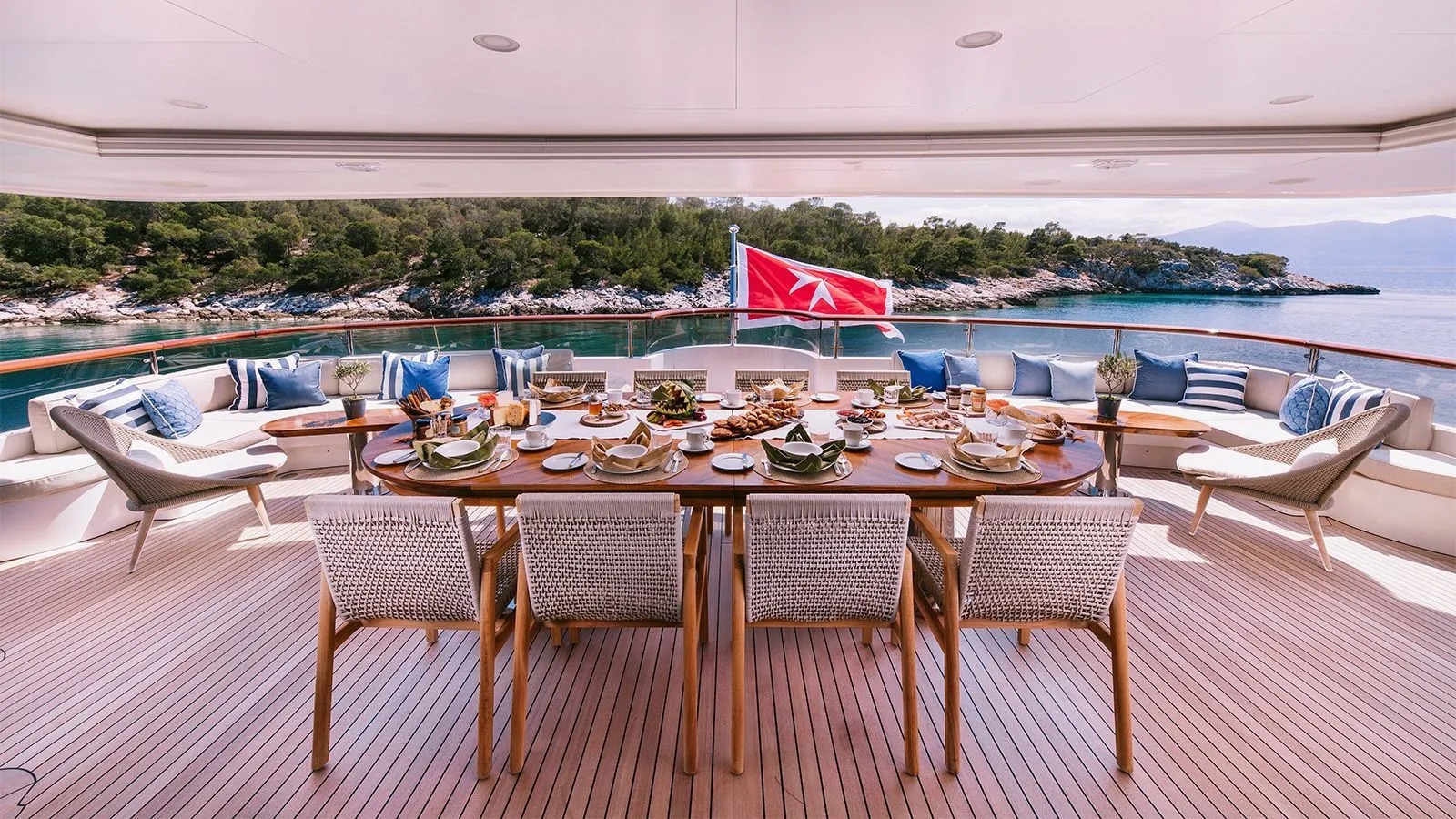 For a more formal outdoor setting to dine, there is a stately table on the upper deck and around the stern, sumptuous sofas with drinks tables allow guests to break away from the main group for more intimate conversations.