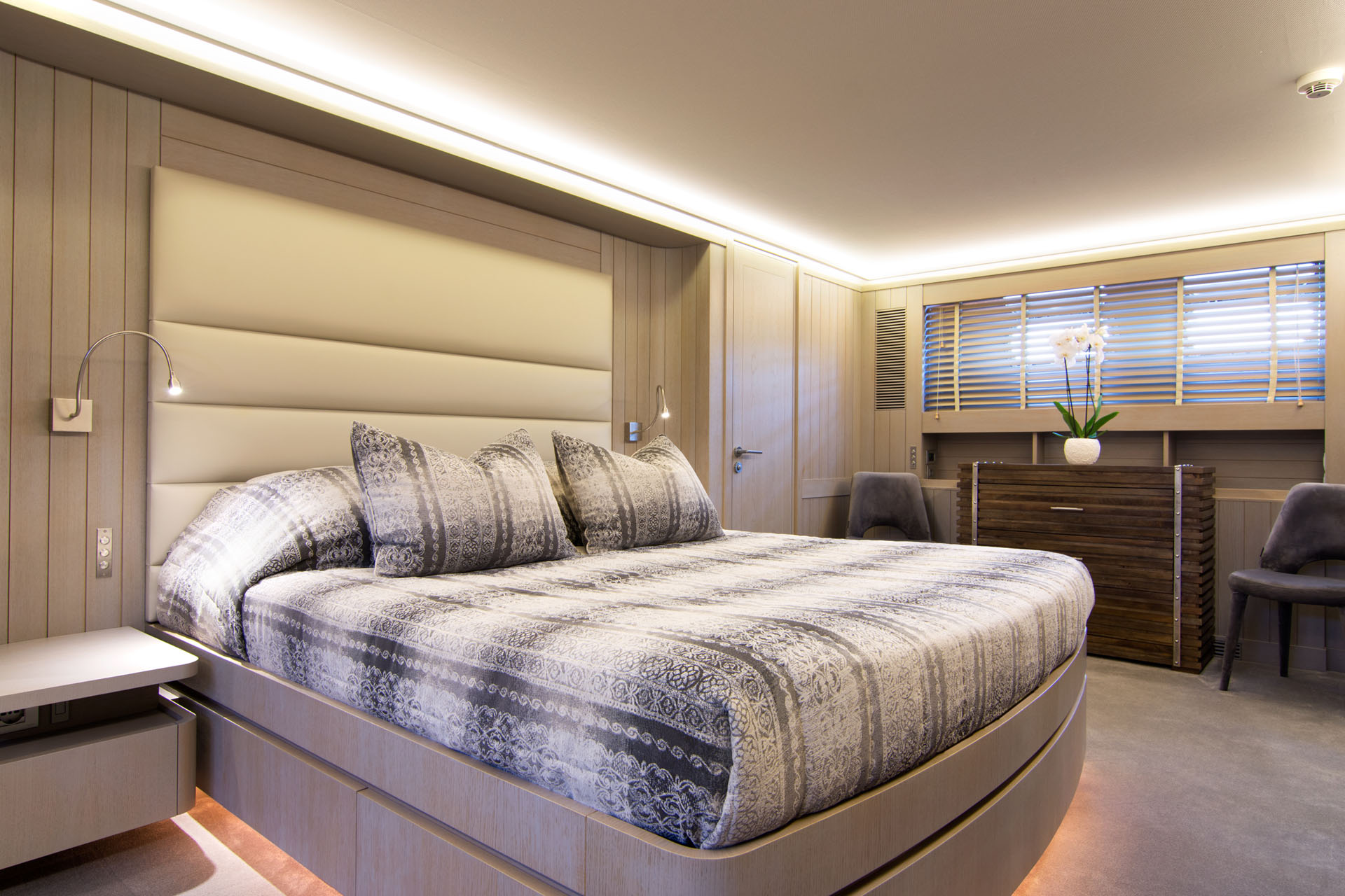 Forward of the engine room is the spacious Master suite complete with a lounge section, walk-in wardrobe and en-suite bathroom with tub, plus one double cabin and two twin cabins.