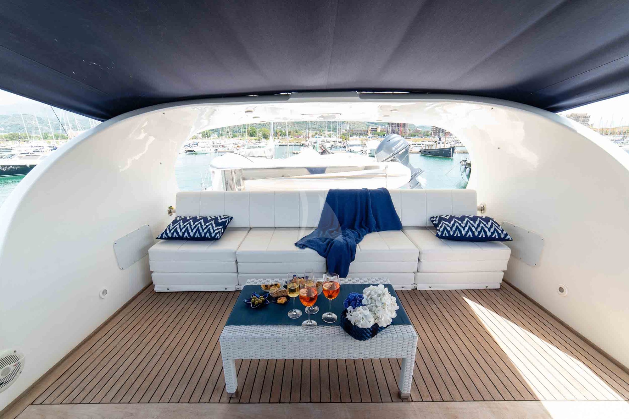 The flybridge provides an alternative relaxation area with sun pad/sofas to the aft and a massive clear central area that can be used for exercise or alfresco dining.