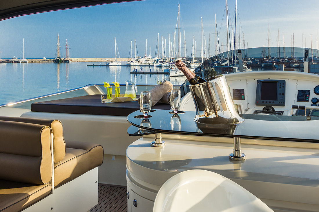 The main deck aft cockpit is fitted with a soft and sumptuous sofa, an alfresco dining table and additional chairs for outdoor relaxation and meals at any hour.