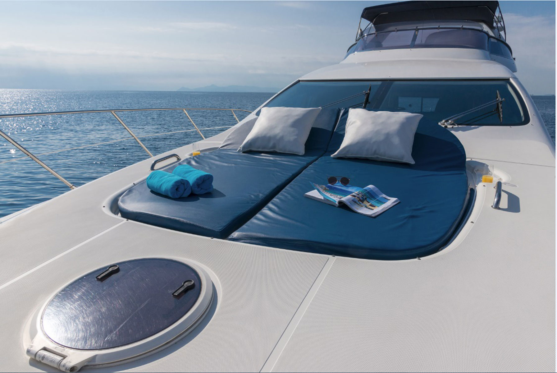 A staircase leads up to the flybridge, where guests will find an alfresco lounge and facilities shaded by a hardtop.