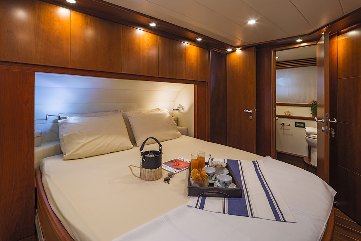 Warm wooden panelling against cream and white coloured furnishings form a timeless environment for up to six guests to relax in and socialise, with three cabins for a restful night's sleep.