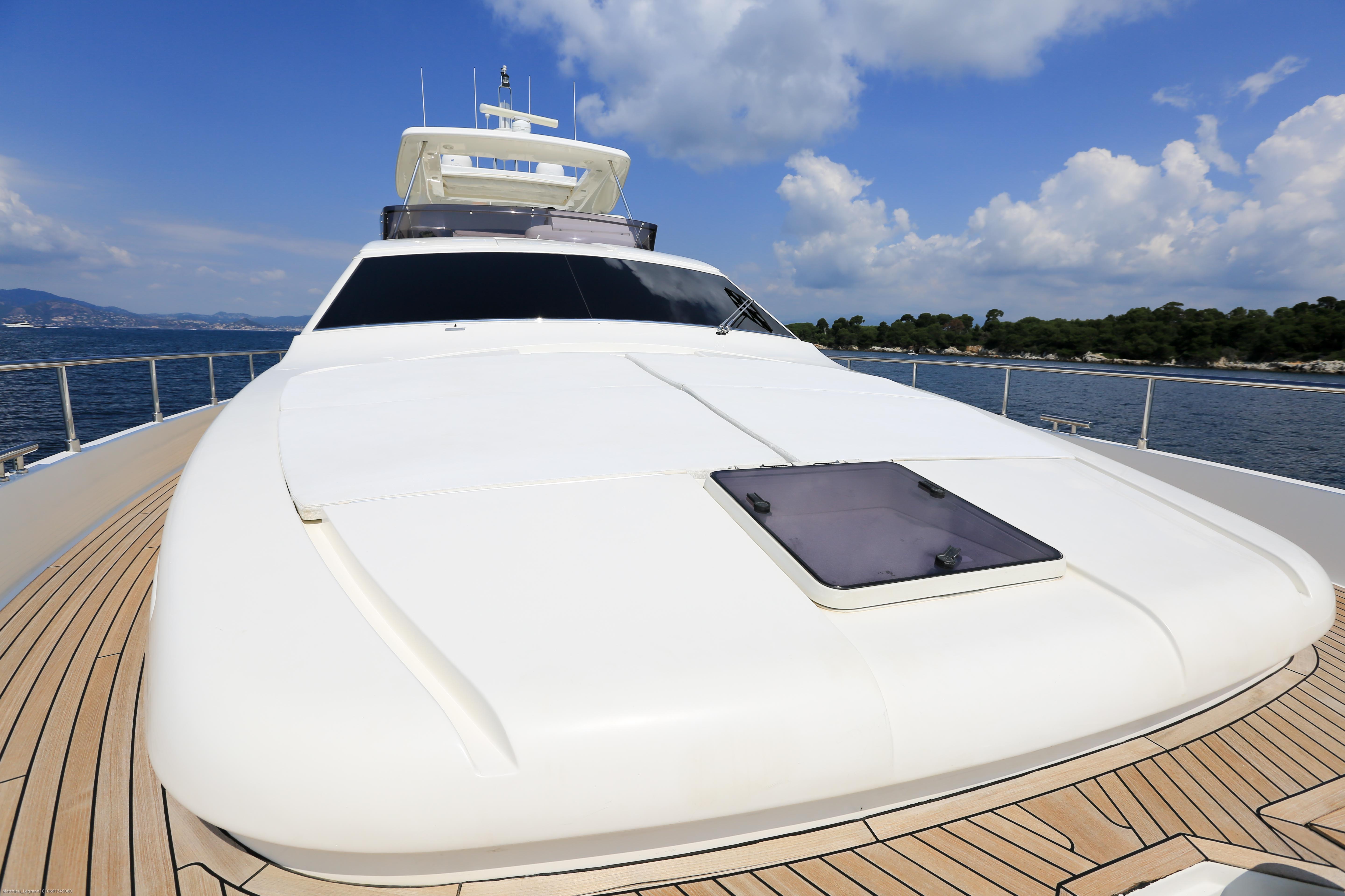 The foredeck is fitted with sunpads for sun-drenched relaxation, while the flybridge above boasts an aft Jacuzzi and sunpad, a barbeque and a C-shaped sofa and table for alfresco meals in the shade.