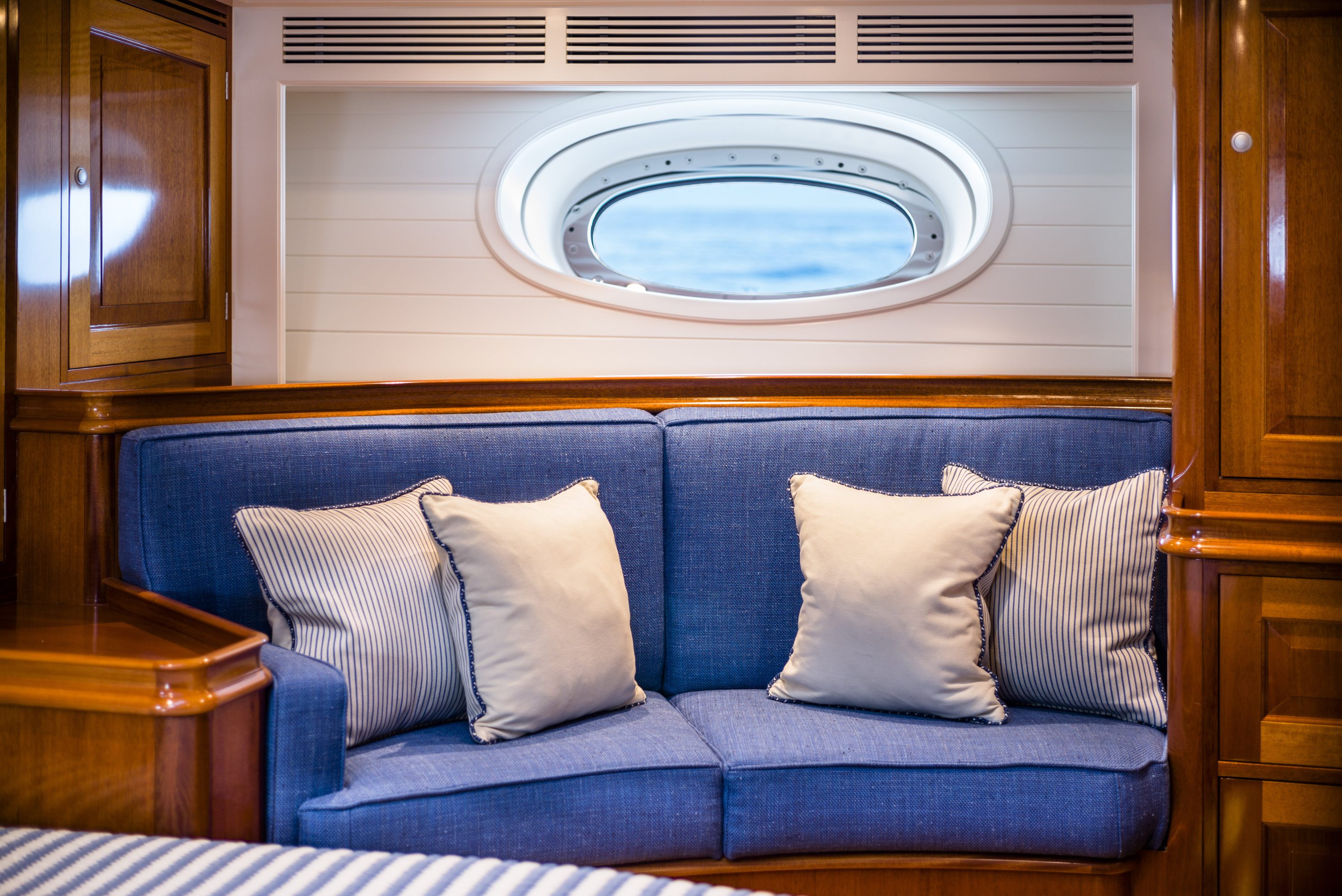 The cockpit can be shaded by a canvas for an all-day outdoor living, and farther aft a broad spread of sofa/sun pads with two small drinks tables.
