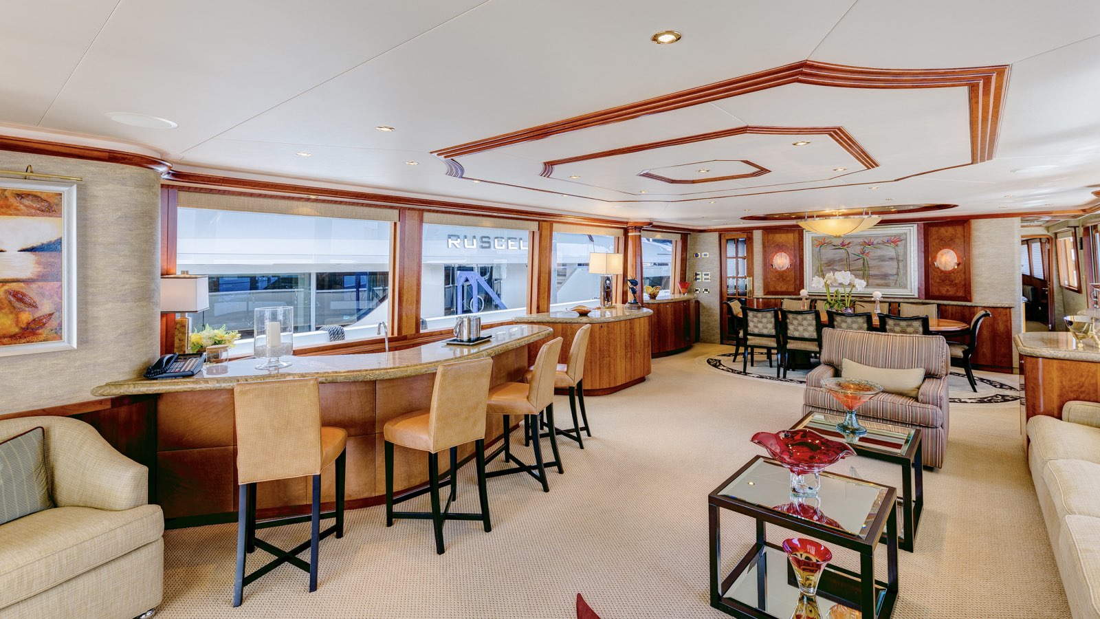 The port side has a bar close to the doors into the main salon and a TV for outdoor entertainment.