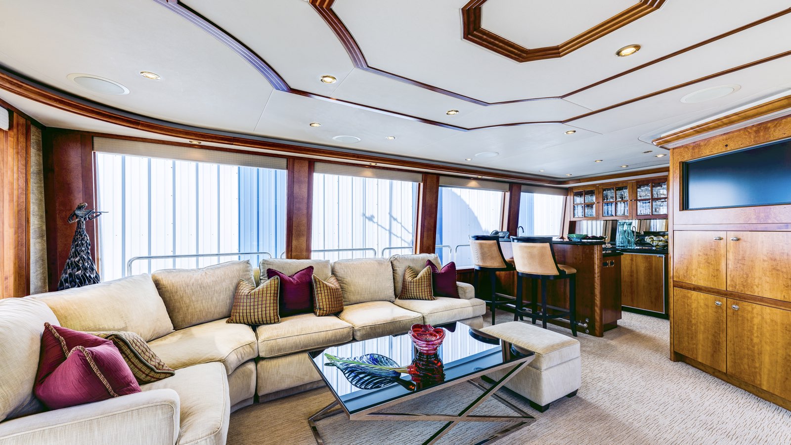 The port side has a bar close to the doors into the main salon and a TV for outdoor entertainment.