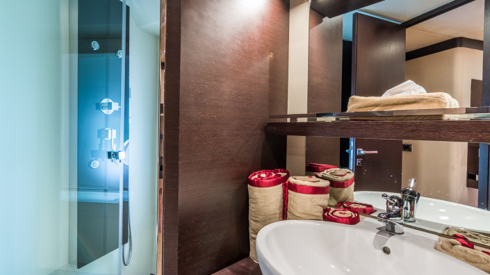 On the port side to the aft, an L-shaped sofa and a coffee table convertible to a dining table. Lighting in the ceiling and table lamps ensure that guests have plenty of illumination throughout their social event, and for ambient ...