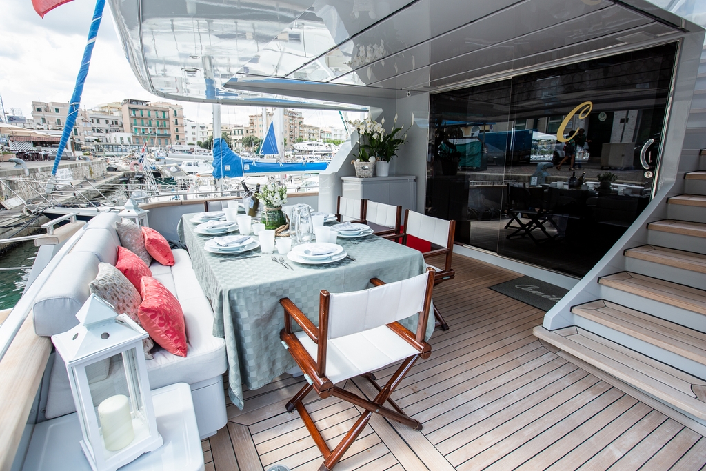 On the main deck aft, there is plenty of room for alfresco dining beneath the flybridge hardtop and guests can sit on the sofa and enjoy a casual meal.
