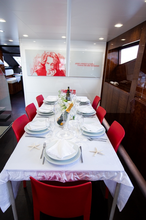 On the main deck aft, there is plenty of room for alfresco dining beneath the flybridge hardtop and guests can sit on the sofa and enjoy a casual meal.
