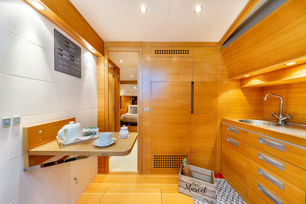 Behind the port helm station, there is an elongated sofa with a footrest, coffee table and a widescreen TV opposite. Starboard of the helm station, an L-shaped sofa and fold-out table create an ideal place for the group to sit ...