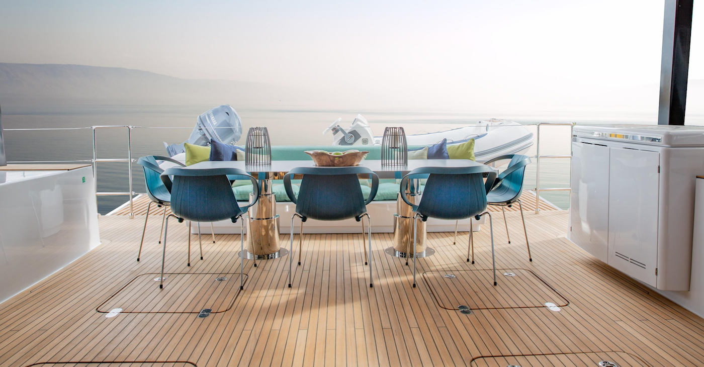 The main deck aft has a generous shaded cockpit, where guests can dine alfresco at the large table with sofa seating or stretch out on the starboard sun pad.