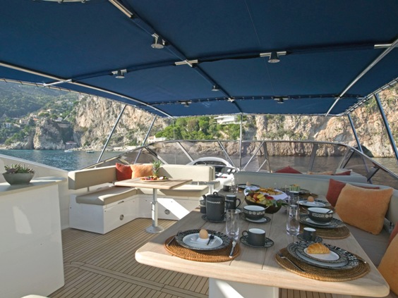The imposing flybridge, with additional helm position, provides unrivalled social space and commanding views. Below deck, meticulous attention to detail has created opulent living areas and comfortable accommodation for up to eight.