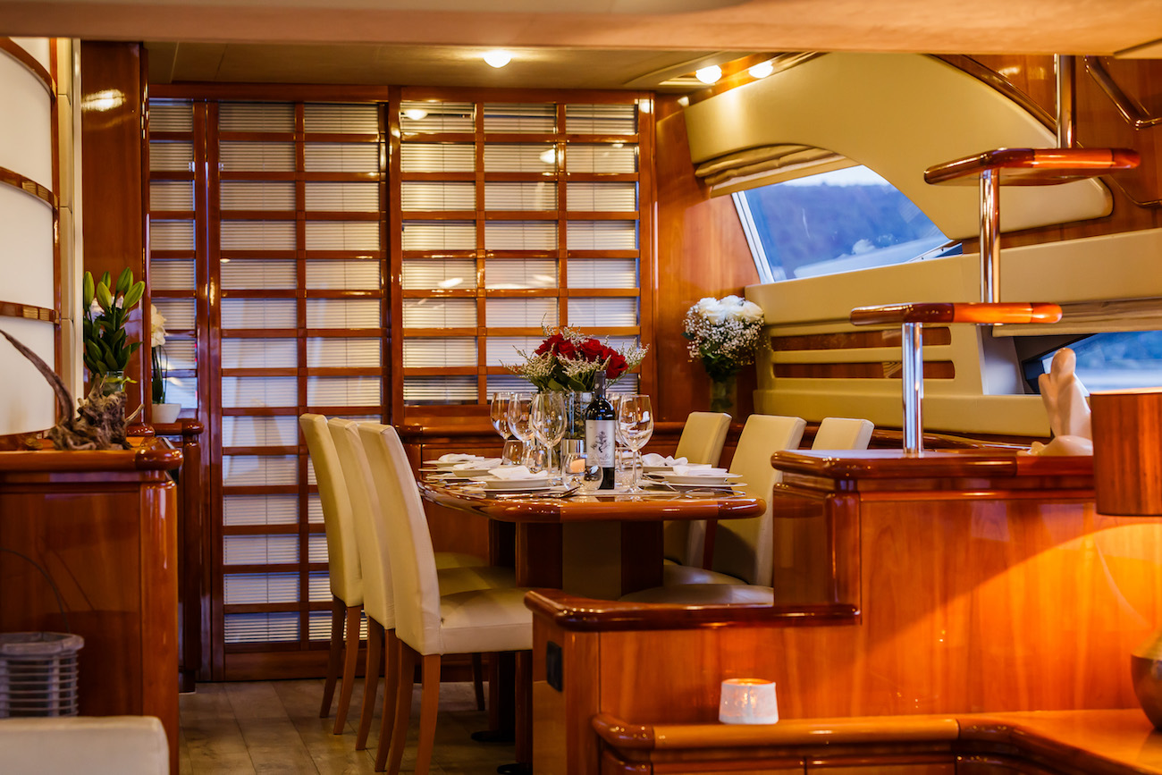 Accommodation on board is offered for up to eight guests in a four-cabin layout.