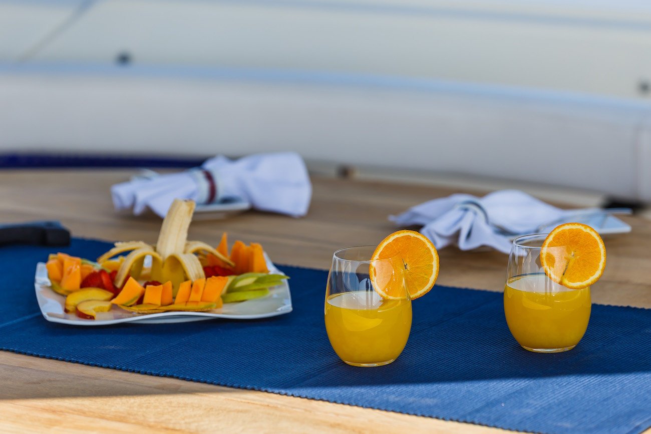 Amidships is the galley with the formal dining room seating eight guests on the starboard side.