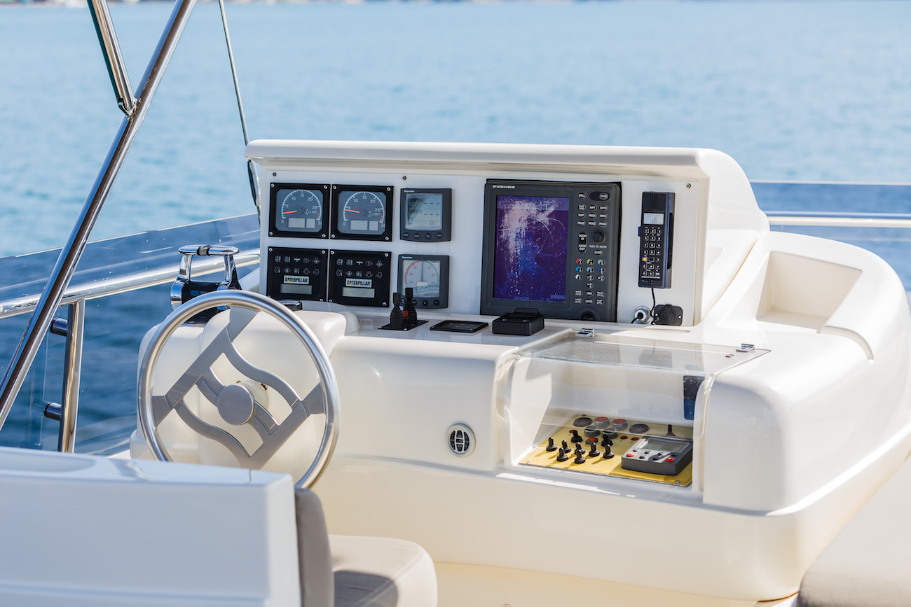 On the main deck, there is a sofa and a table beside the helm station for guests to relax and take in the forward views while remaining inside.