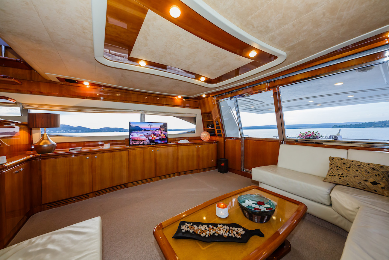A C-shaped sofa with a coffee table is placed beneath the port windows and opposite a widescreen TV sits upon the cabinetry.