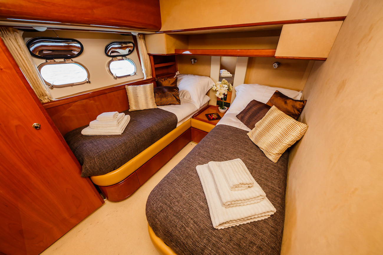 Accommodation on board is offered for up to eight guests in a four-cabin layout.