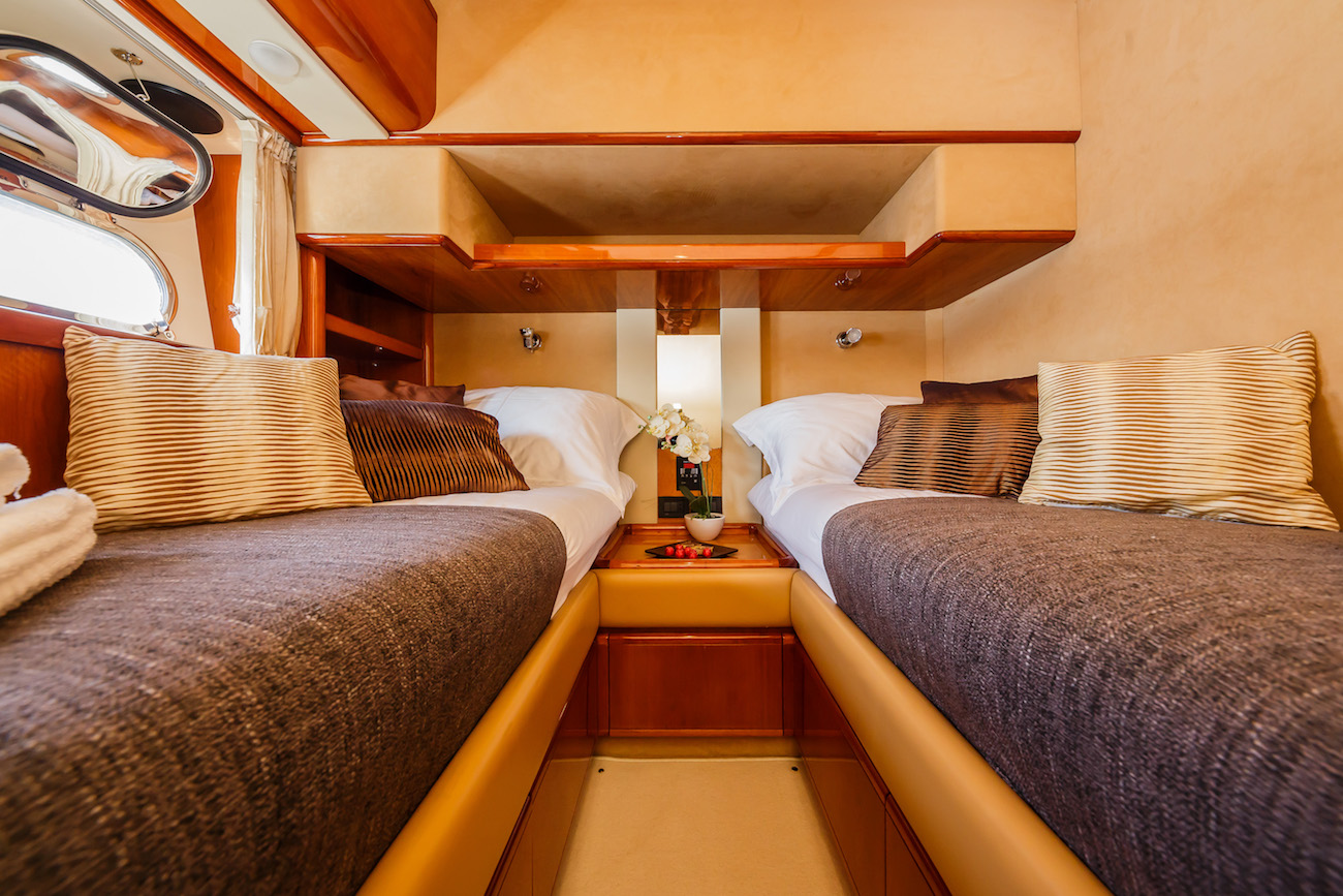 A pair of Caterpillar 1,520 HP engines provides a top speed of 33 knots and a cruising speed of 20 ...