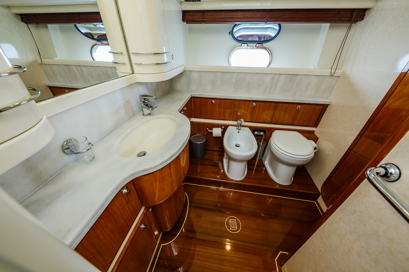 The Master suite is positioned amidships and contains a sofa, deck, walk-in wardrobe and en-suite bathroom. Farther forward, one twin cabin has an en-suite bathroom and the starboard side twin cabin has a bathroom across the hall.