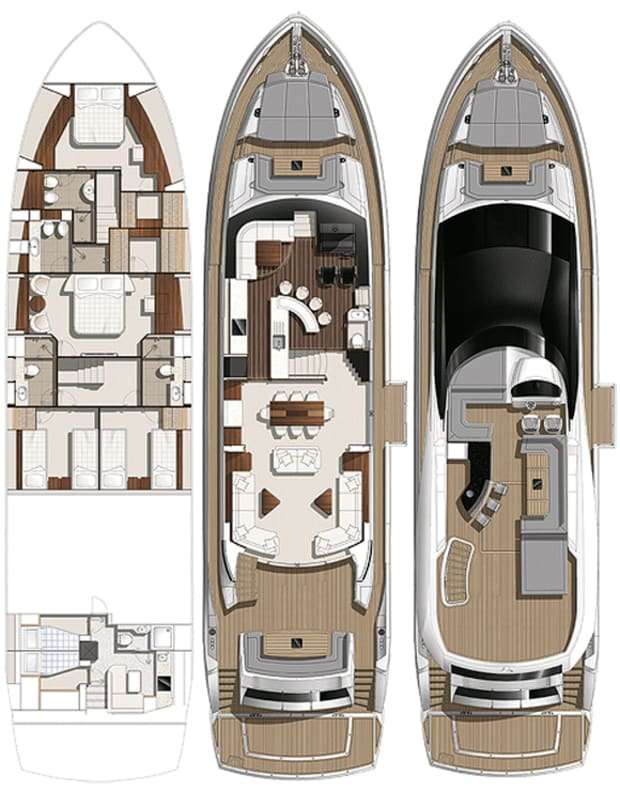 Two en-suite twin cabins convertible to doubles are placed amidships with the full-beam Master suite containing a day bed and en-suite bathroom placed forward and the en-suite VIP stateroom in the bow.
