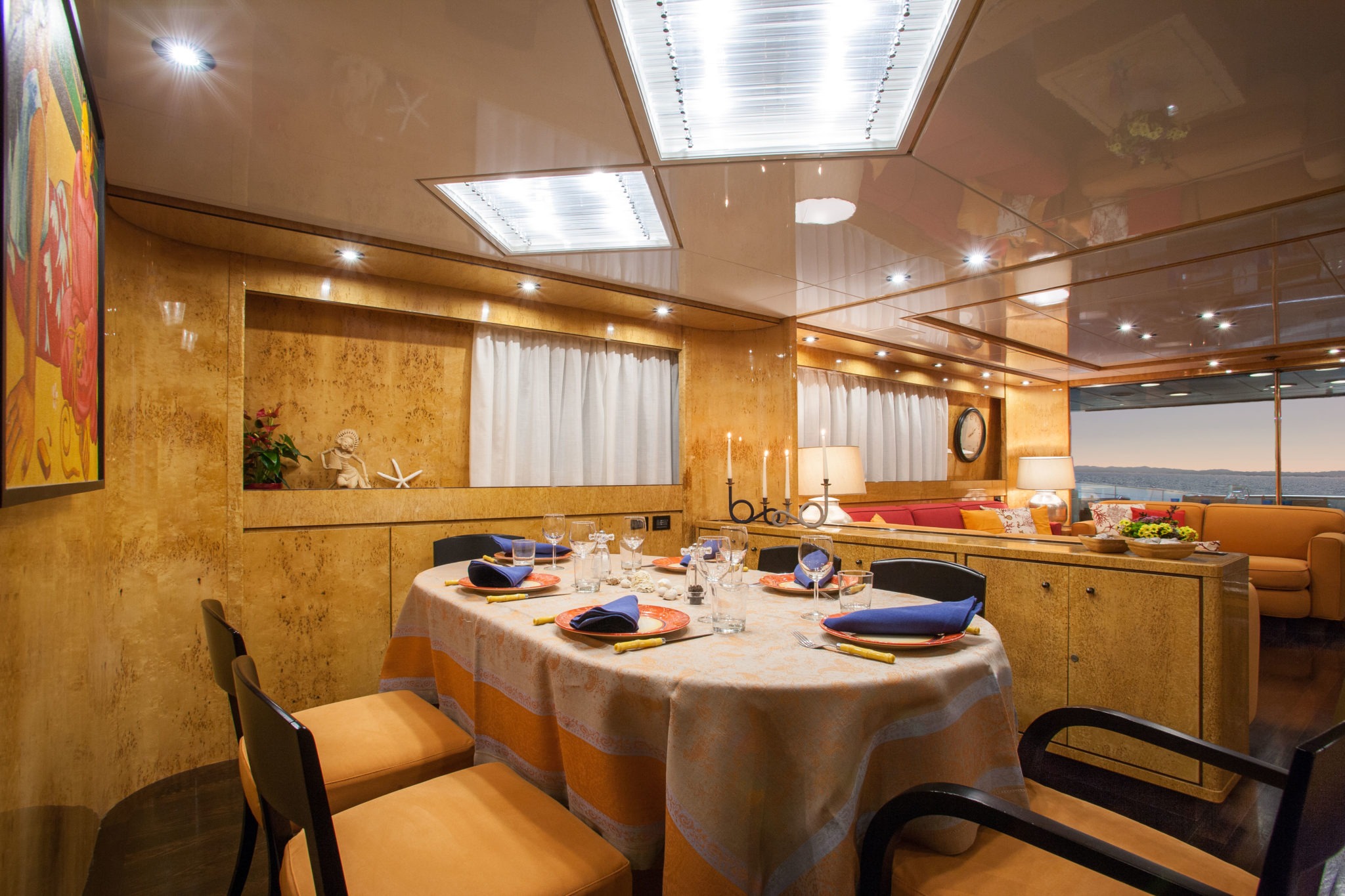 Guests can dine alfresco in the fresh air with an aft sofa, a broad dining table and additional chairs.