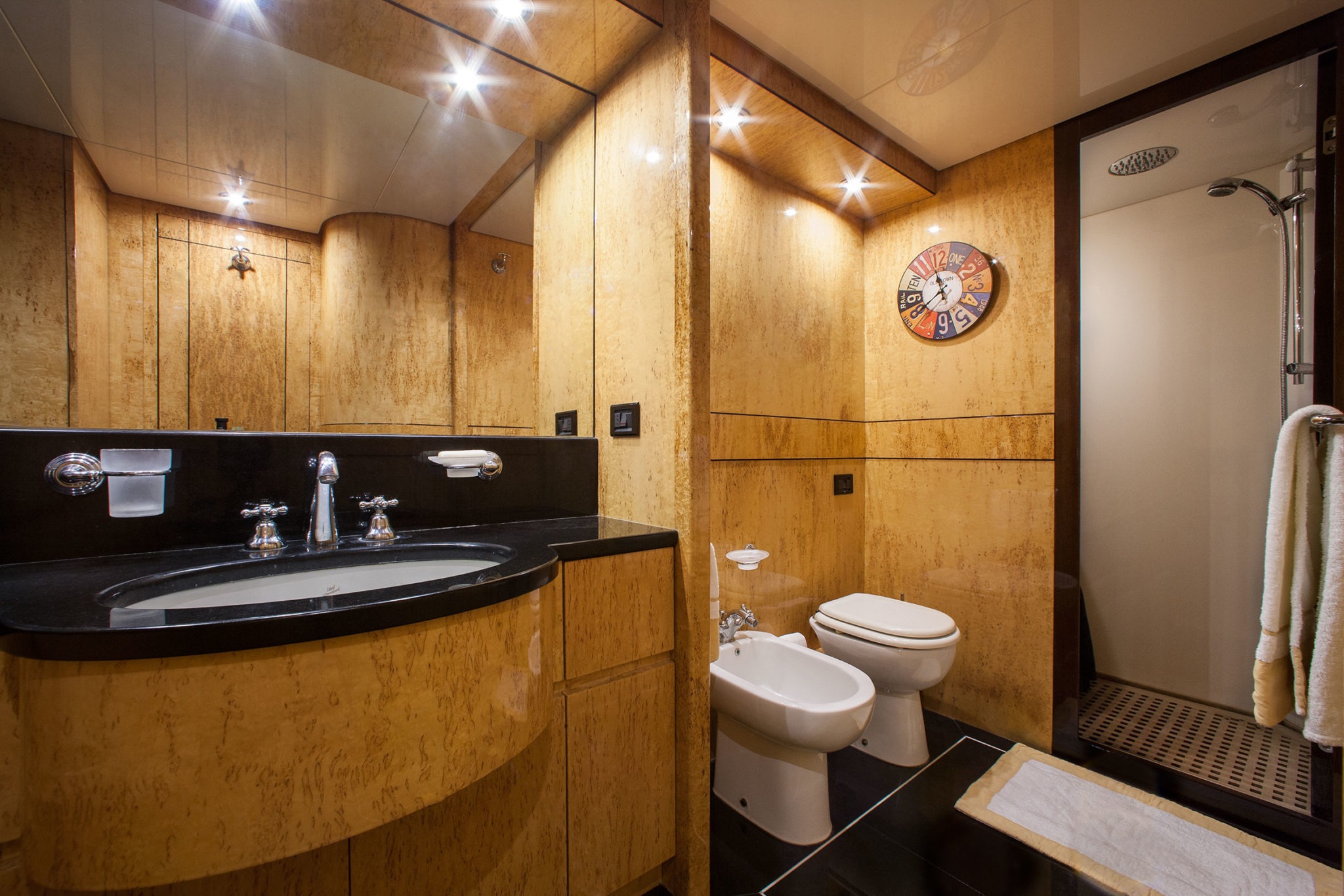 The spacious aft salon places the six-seater formal dining area at the front and behind, three sofas placed around a coffee table on the starboard-side ensure that guests can enjoy excellent views in air-conditioned comfort.