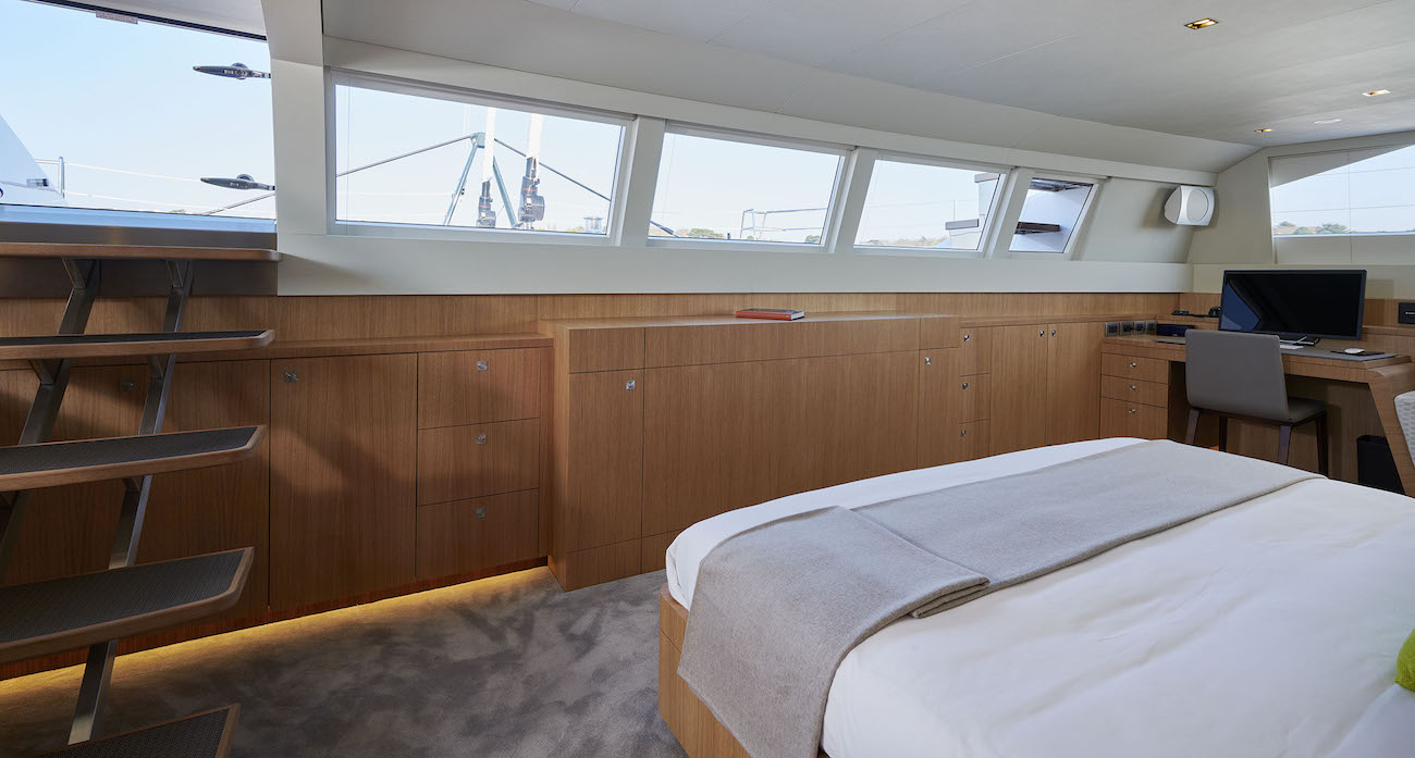 The navigation desk is centrally positioned at the front of the room. Farther forward and underneath, the Master suite enjoys excellent forward views and plenty of daylight to enjoy from the corner sofa or bed.