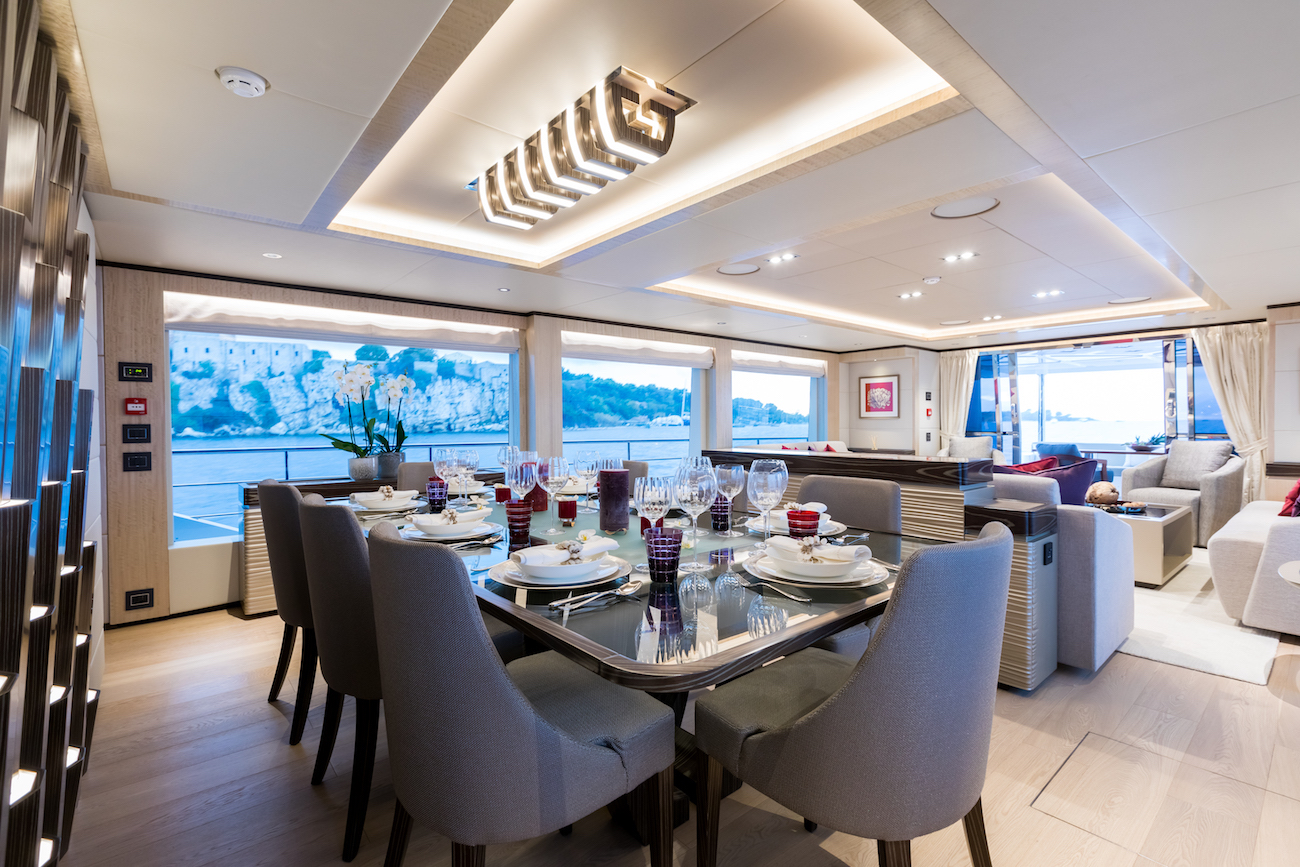 To the aft, there is a formal dining area to seat up to 10 guests to a lavish meal while the salon offers three sumptuous sofas and additional armchairs and coffee tables for the ideal setting to begin or wind down an ...