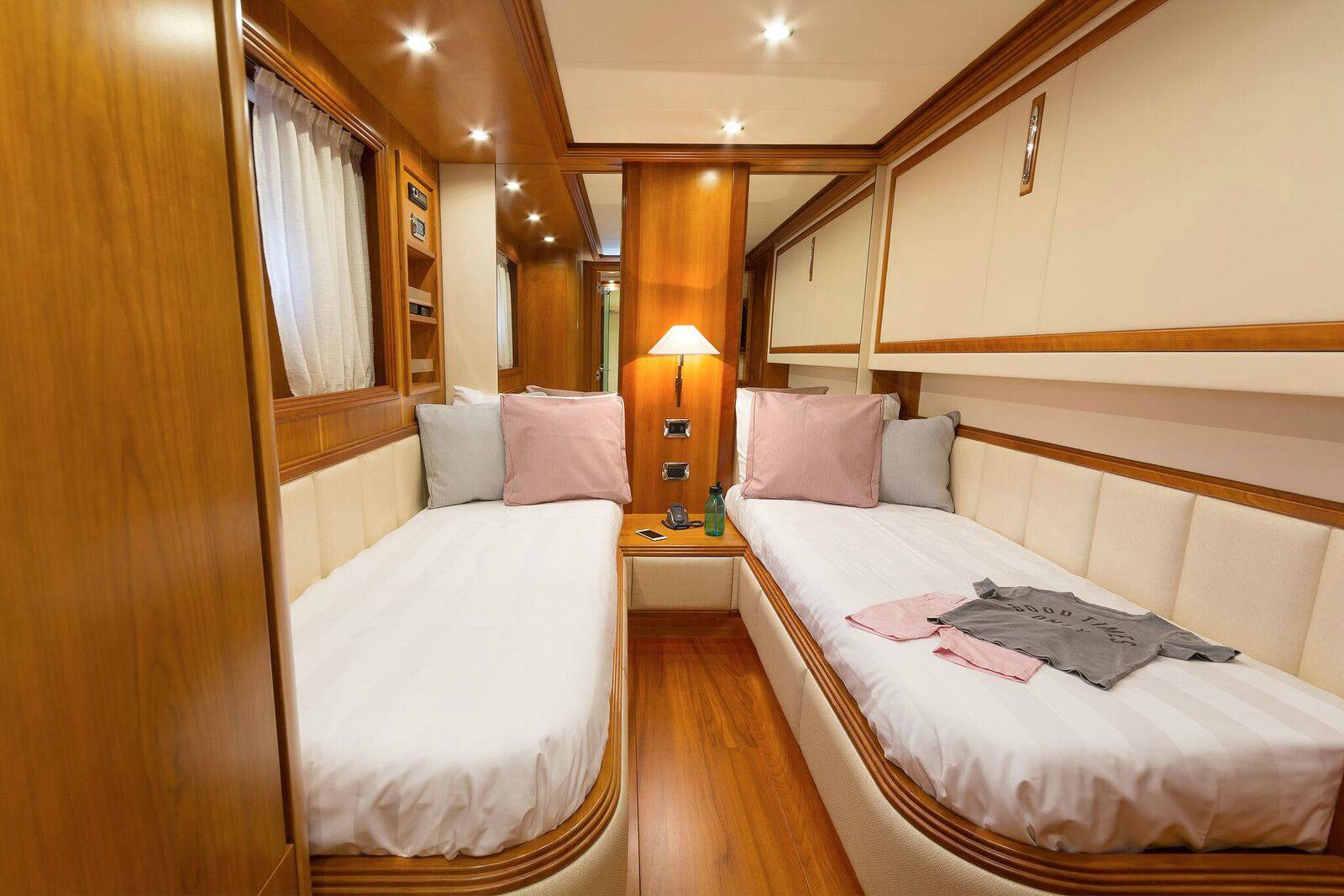 In front is the engine room followed by the full-beam Master en-suite with walk-in wardrobe and en-suite bathroom. Two en-suite twin cabins each with a Pullman berth occupy the space amidships and an en-suite VIP stateroom can be found in the bow.