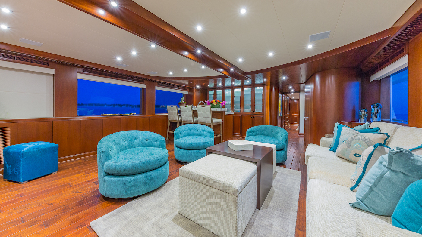 Blue tones are used for chic and tranquil interiors perfect for laid-back cruising as well as close celebrations between family and friends.