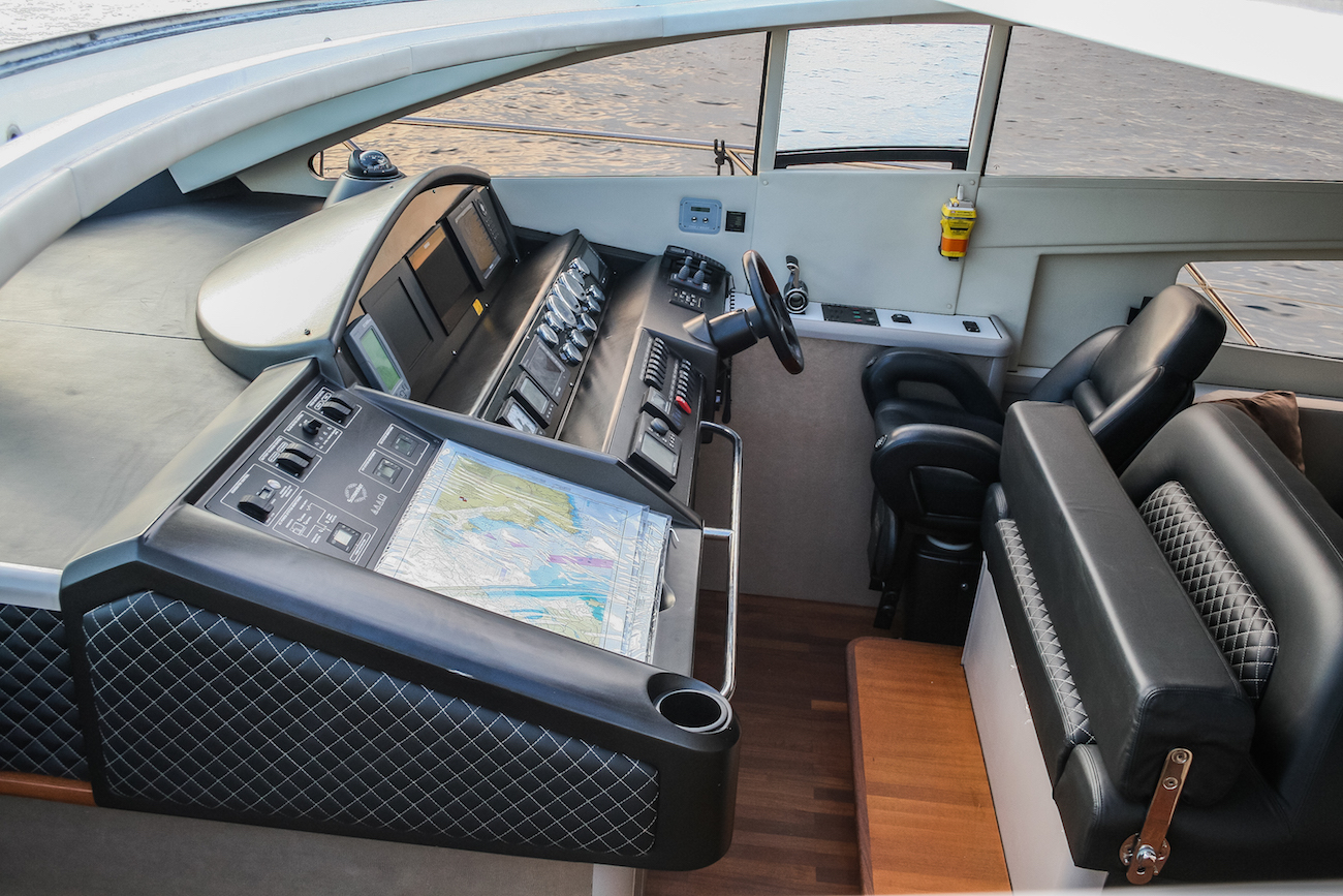 Behind the helm station, there is a C-shaped port side cabin with a coffee table for casual meals, and a widescreen TV is concealed within the cabinetry behind the additional seating.