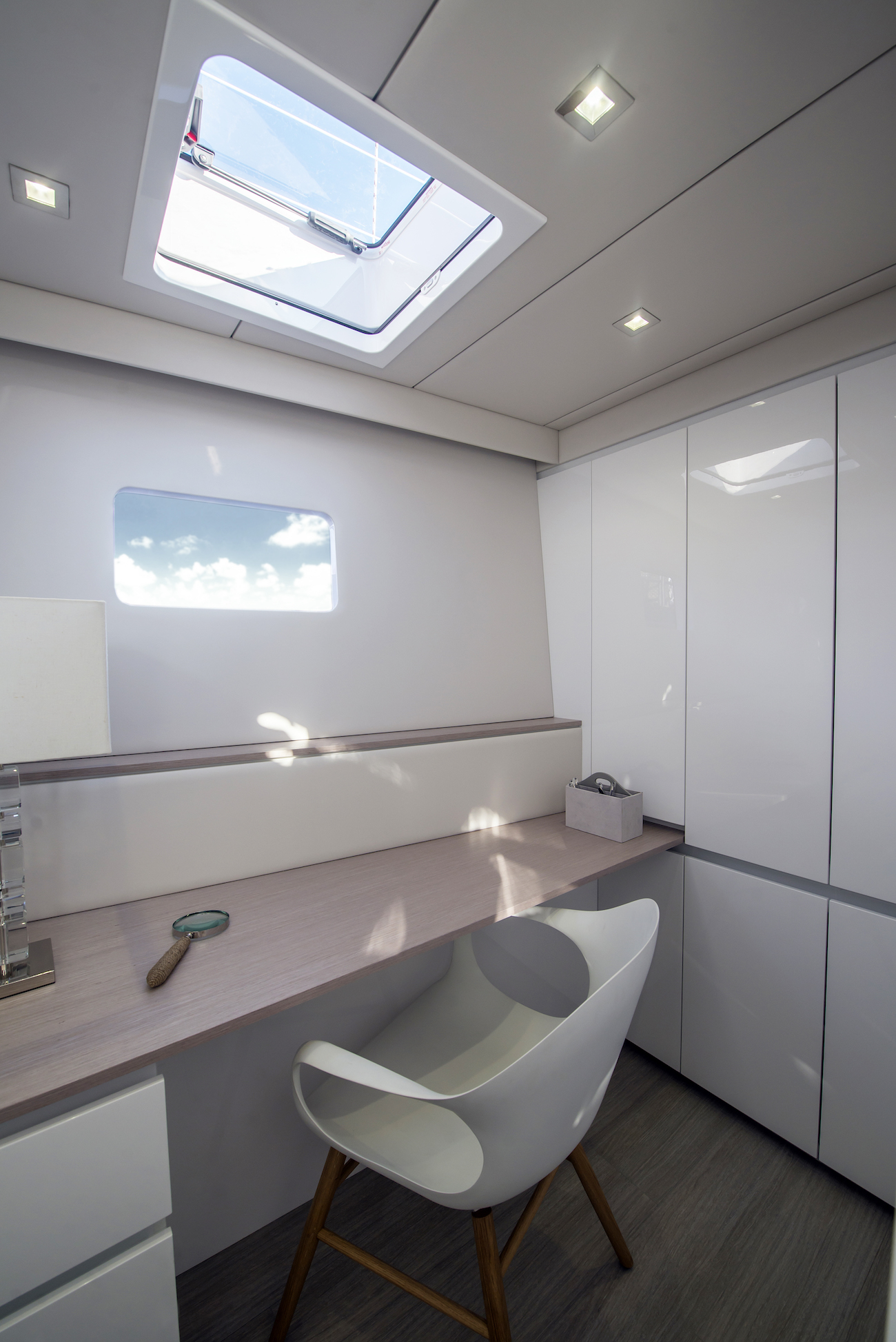 The lower section is fitted with a port galley and opposite a large L-shaped sofa with a raised table for dining in air-conditioned surroundings while still enjoying the beautiful views.