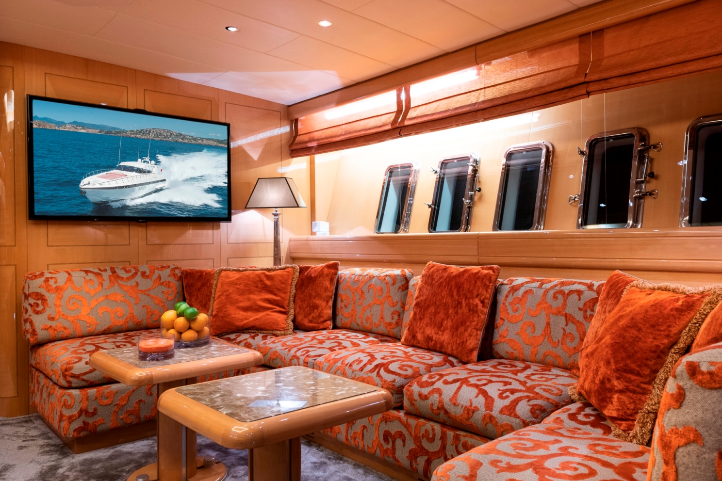 Below deck, the spacious salon places a C-shaped sofa on either side of the room, with the port table ...
