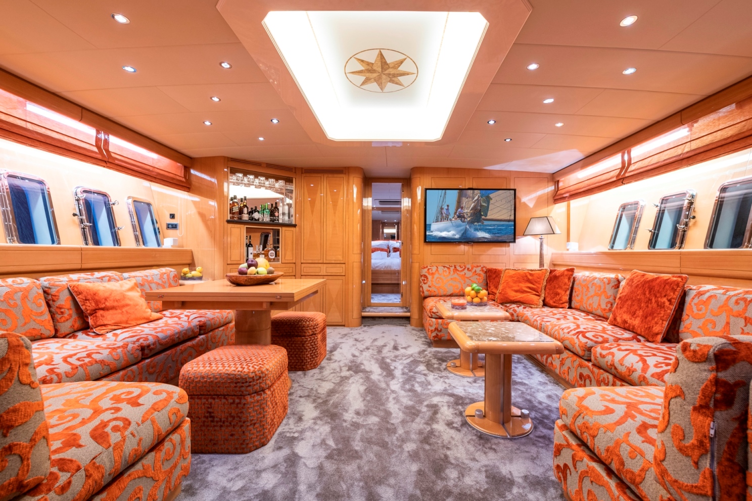 Below deck, the spacious salon places a C-shaped sofa on either side of the room, with the port table ...