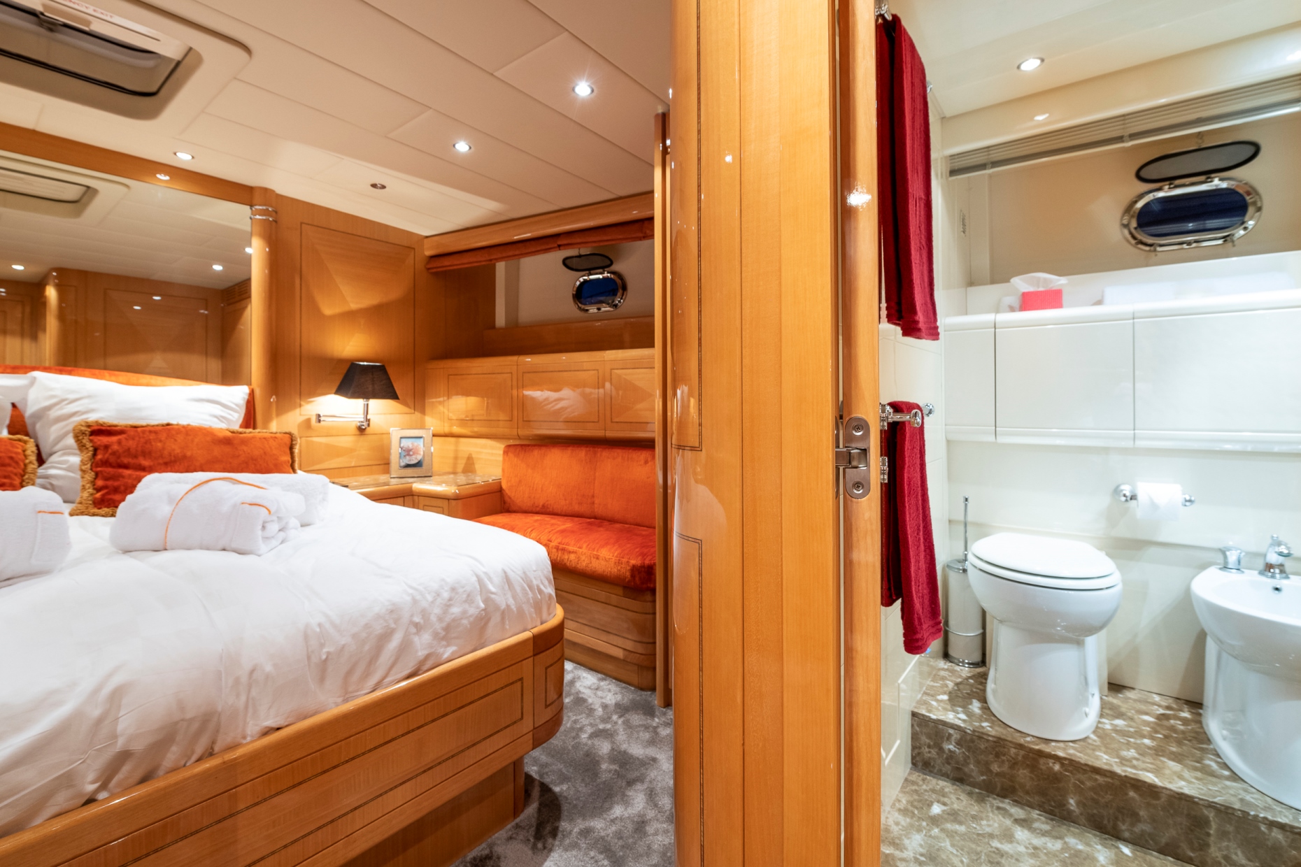 The Master suite is placed forward with its own sofa as well as an en-suite bathroom. Two other guest cabins are placed aft of the salon.