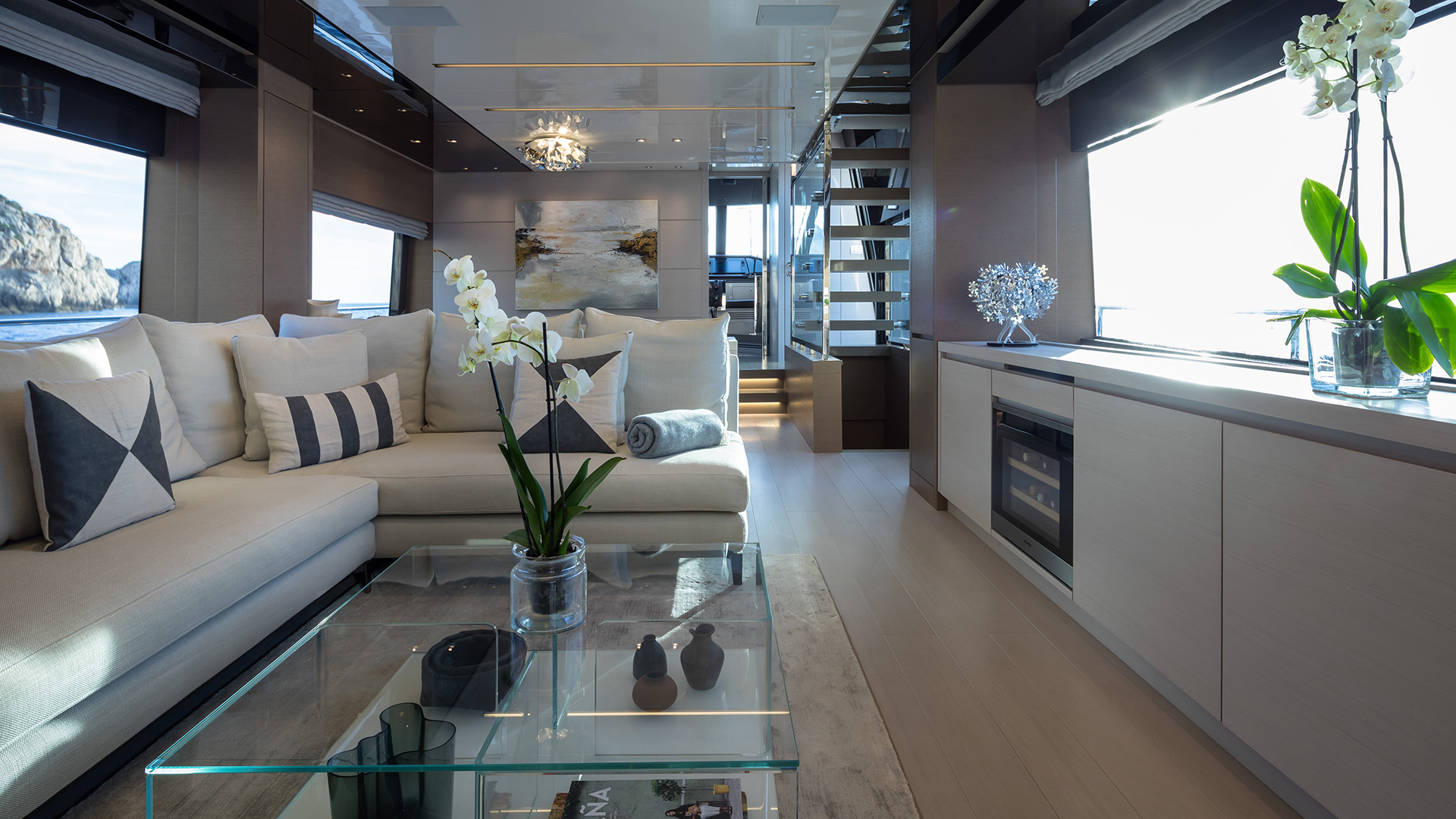 The main deck layout places a C-shaped sofa to the aft and an armchair opposite, leaving room amidships for the galley and formal dining area, which ...