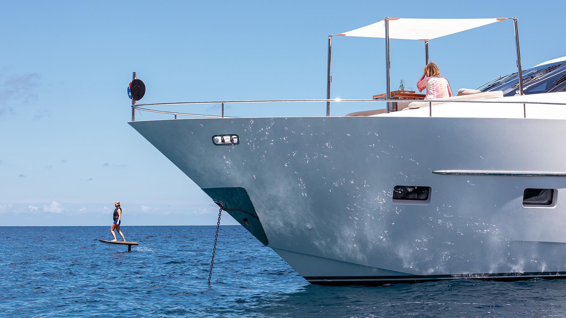 A sun-exposed alfresco dining area of the same shape is available on the foredeck, and after a meal or drinks the ground can rest on the bow sunbed.