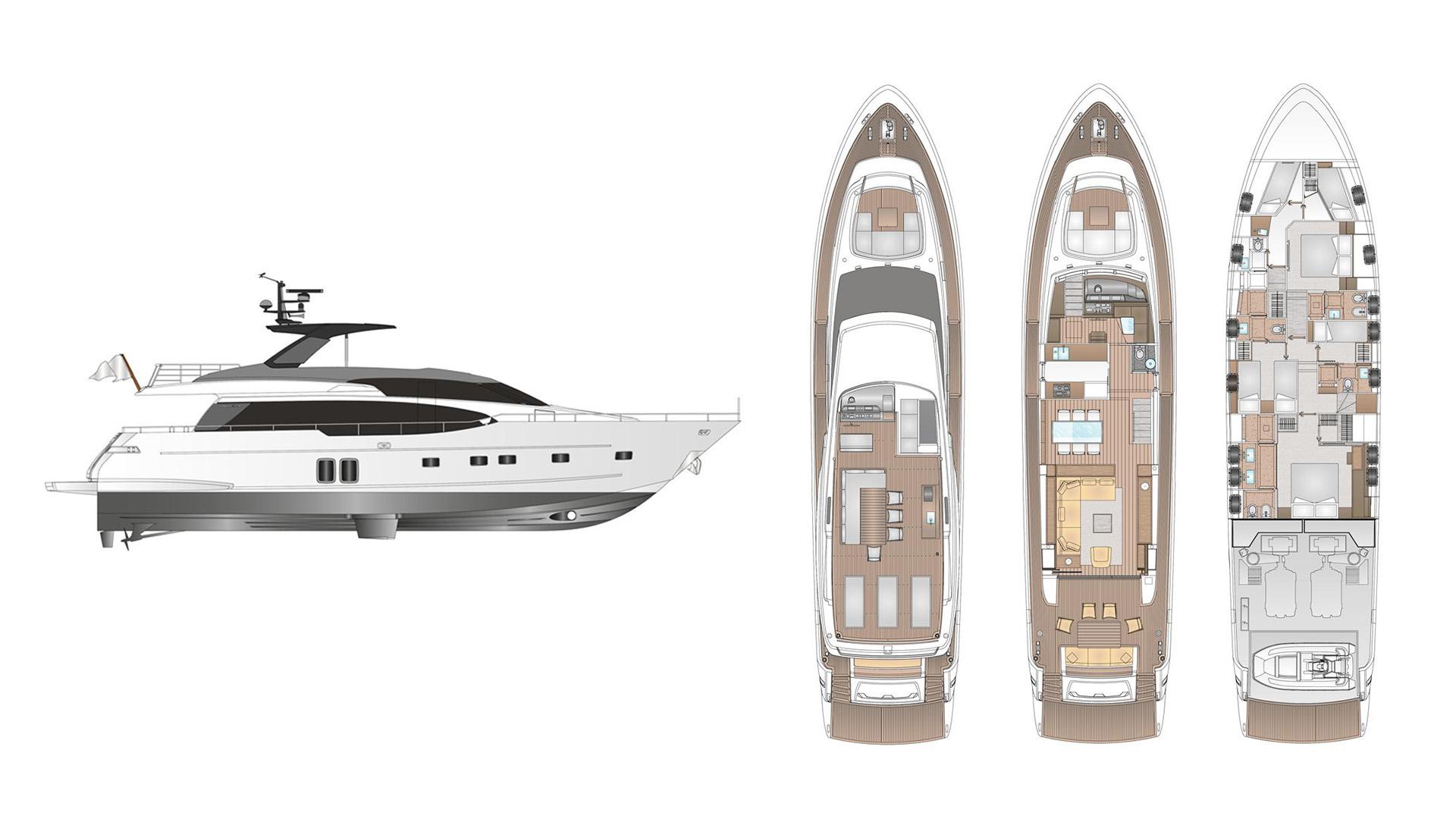 The main deck layout places a C-shaped sofa to the aft and an armchair opposite, leaving room amidships for the galley and formal dining area, which ...