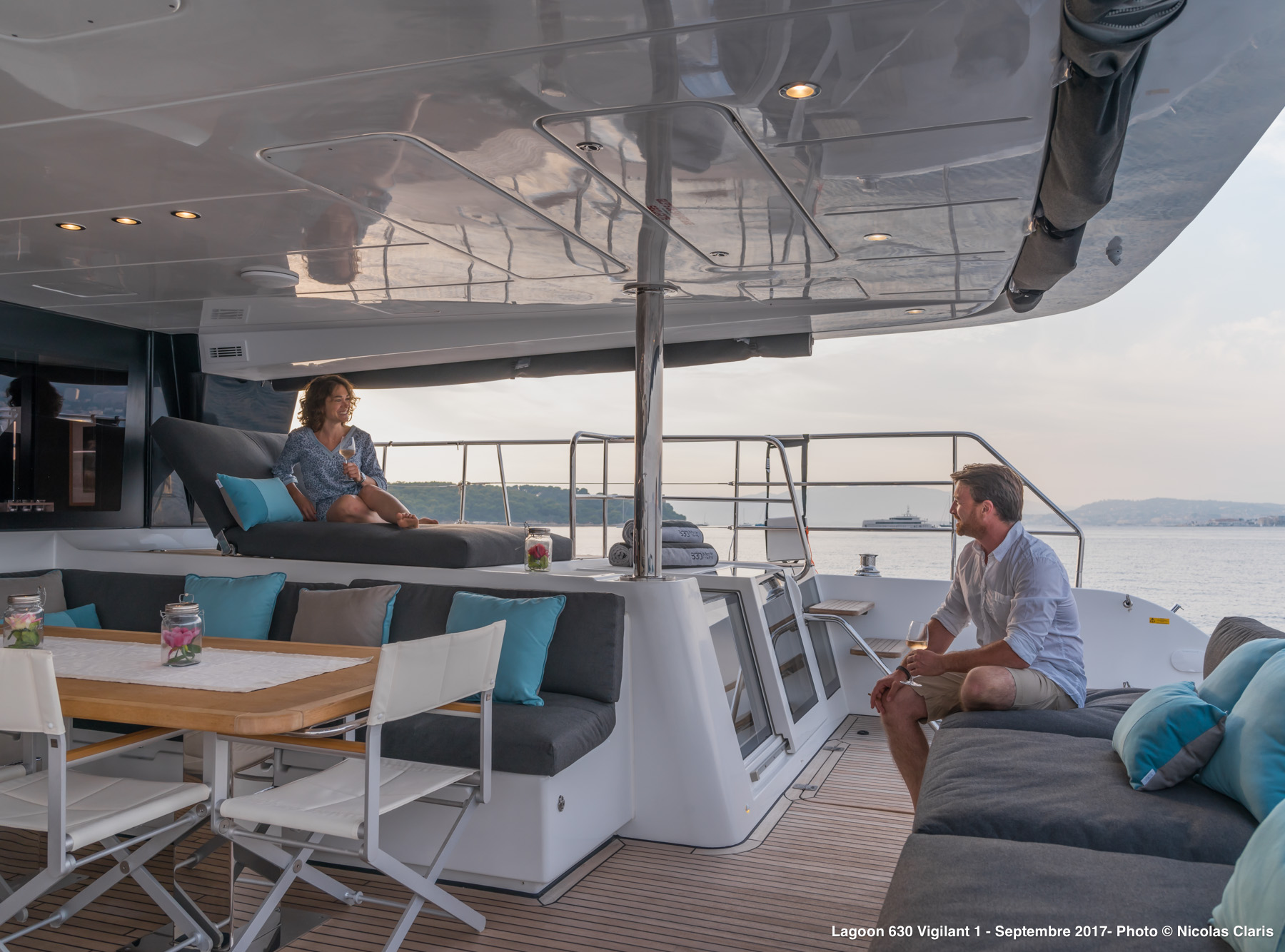Two stairways lead to the main deck aft cockpit, where a sofa lines the stern, while under the flybridge overhang, there is a starboard sunpad and an L-shaped sofa, with a raised table and additional chairs for alfresco dining in ...