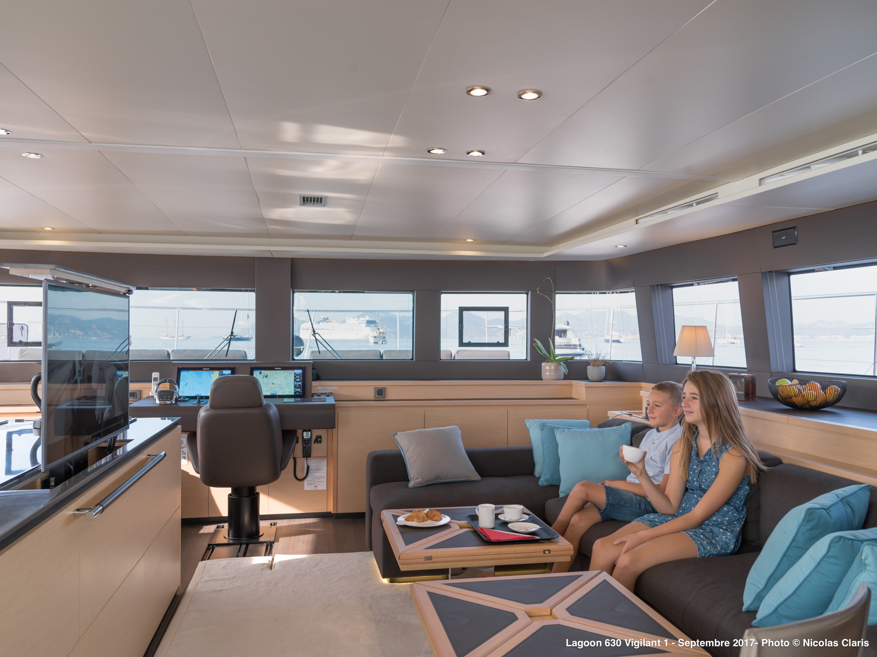 On the main deck, the interior salon is divided between a starboard C-shaped lounge with two drinks tables that convert into a larger dining table. A widescreen TV that pops up from inside the edge of the galley island counter, with the galley appliances and additional preparation area to port.
