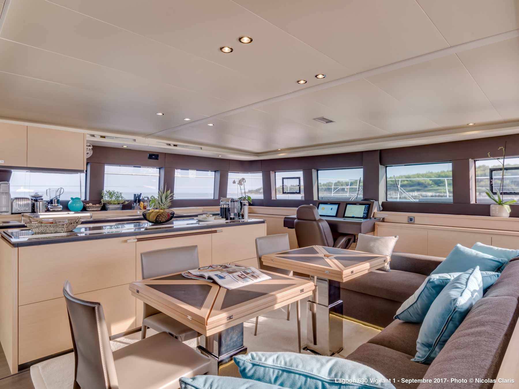On the main deck, the interior salon is divided between a starboard C-shaped lounge with two drinks tables that convert into a larger dining table. A widescreen TV that pops up from inside the edge of the galley island counter, with the galley appliances and additional preparation area to port.