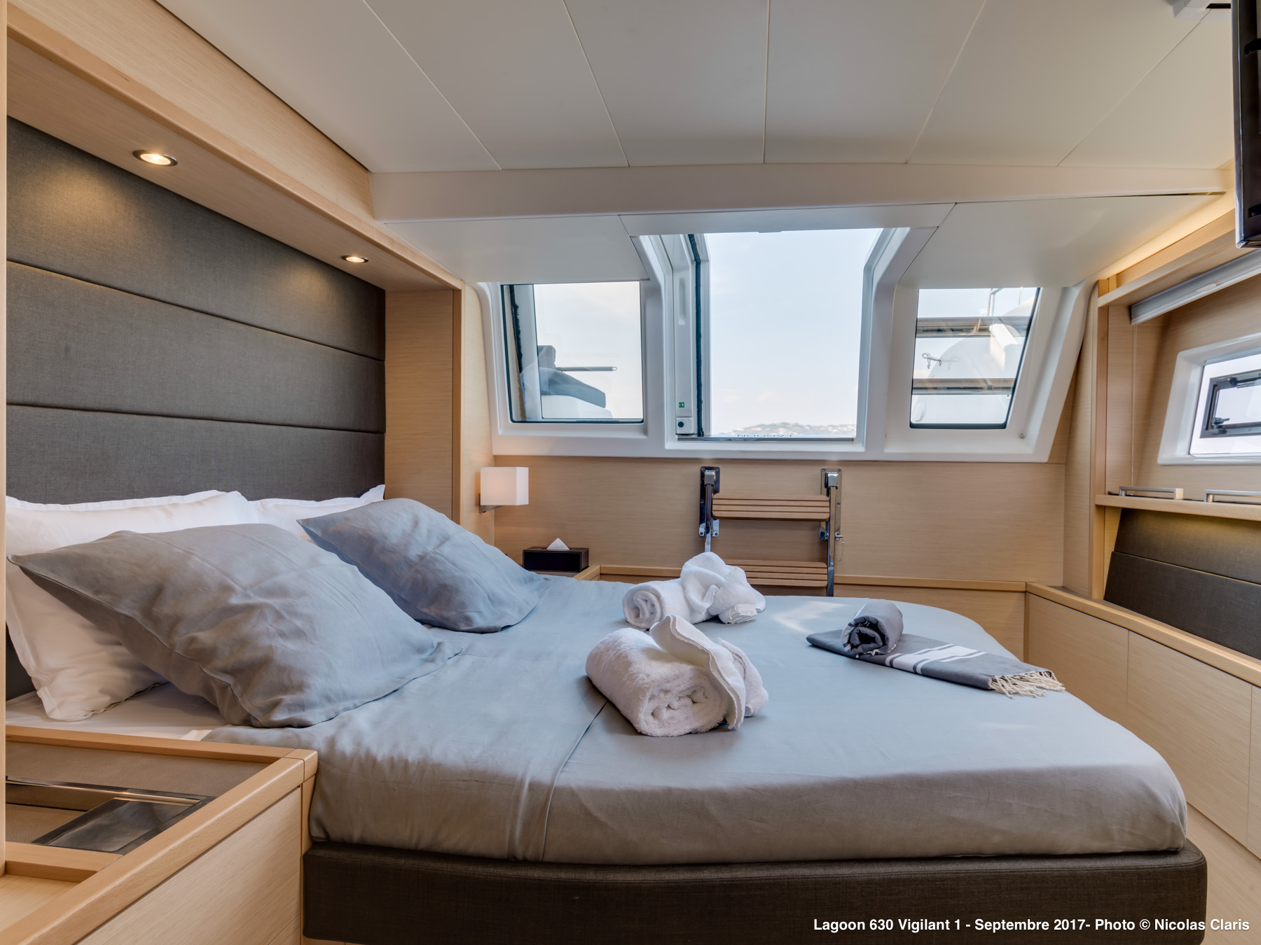 The lower deck contains the guest accommodation which consists of four guest cabins as well as crew accommodation for three.
