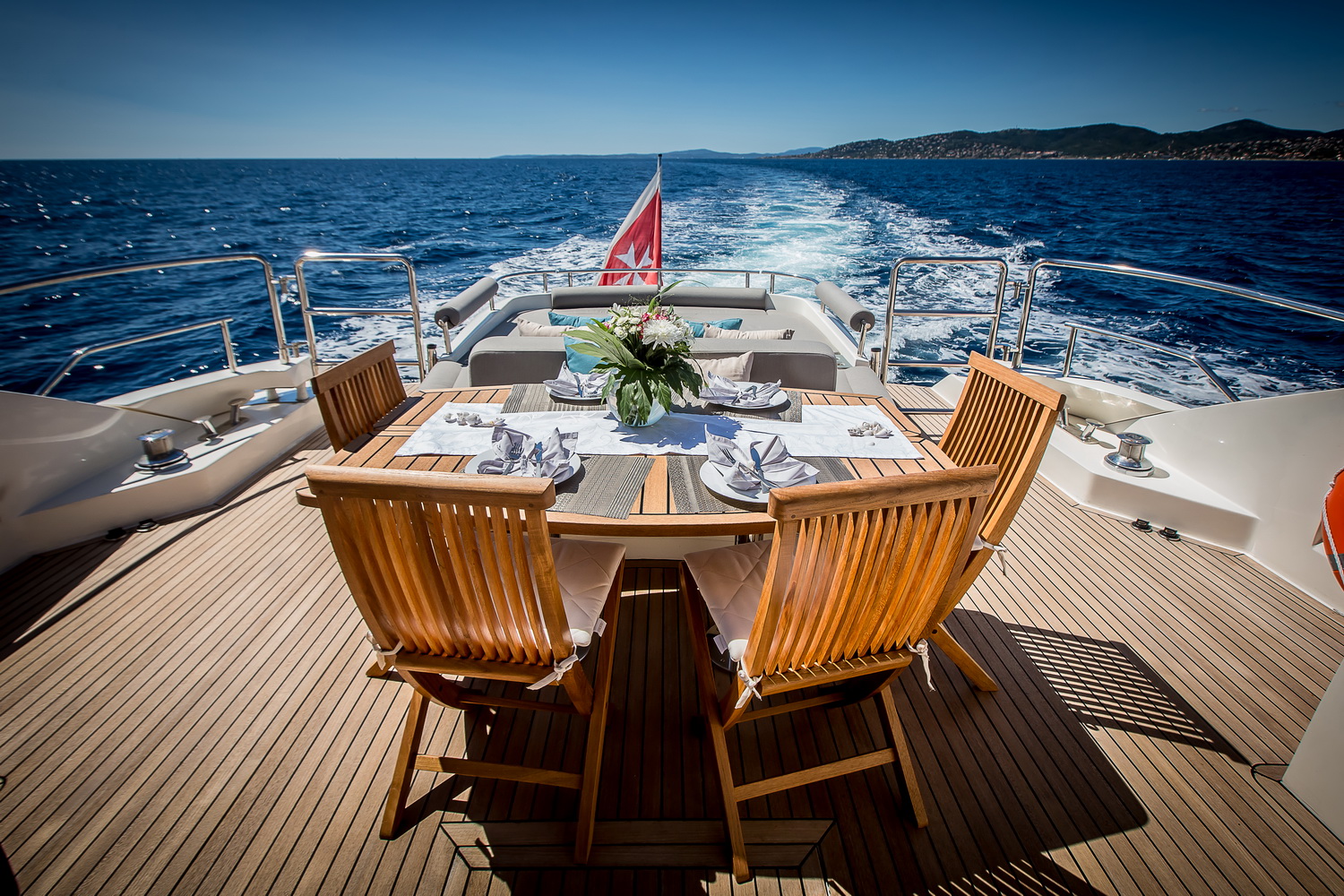 Near the doors to the main deck salon, there is an alfresco dining table with six chairs for guests to enjoy uninterrupted port, aft and starboard views. Another sunbed is available on the foredeck in front of the helm station, ...